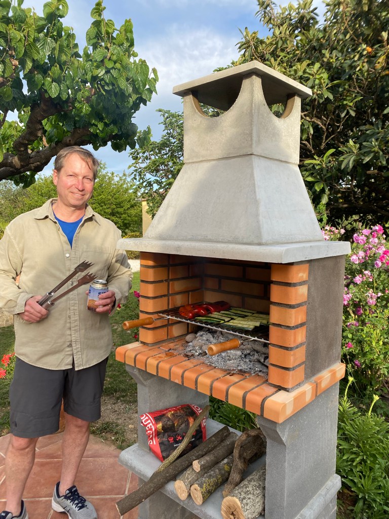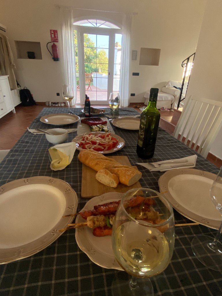 They had 2 sweet dogs, 2 cats, 2 horses, and a pen with chickens. We absolutely loved it! On our first night Stephen grilled some kebabs and red peppers on the barbecue and we had a tomato and onion salad along with a baguette.