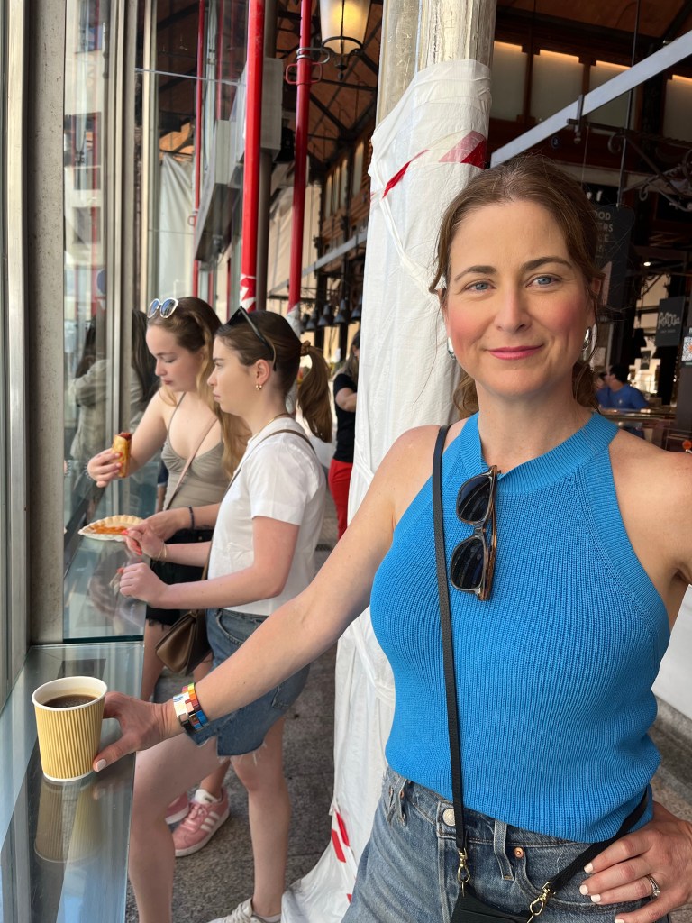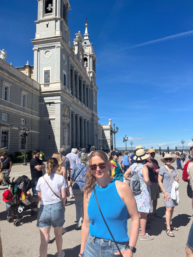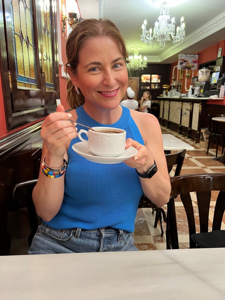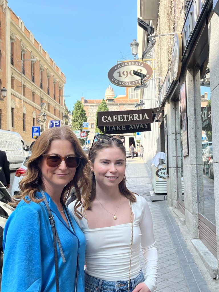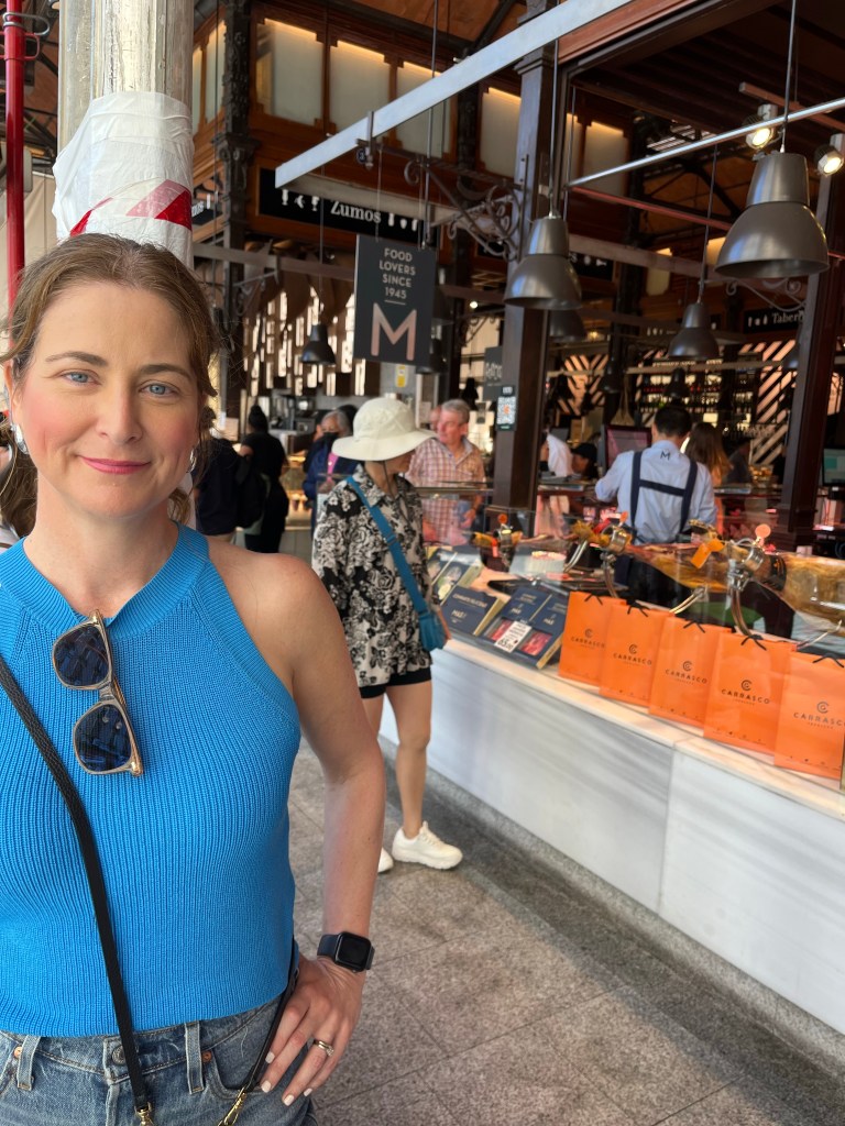 Today is our wander around the city day. Nothing was booked so we were totally on our own time line. For breakfast Macy and I grabbed the famous pastries from La Mallorquina. So buttery and flakey and delicious! And then stopped in at the Mercado de San Miguel for a coffee and a sausage roll for Makena. And I’m Pleased to report that the market was not insane at this early hour and I did not have a melt down lol. I even have a picture to prove it! Ha! Look at me all cool as a cucumber!