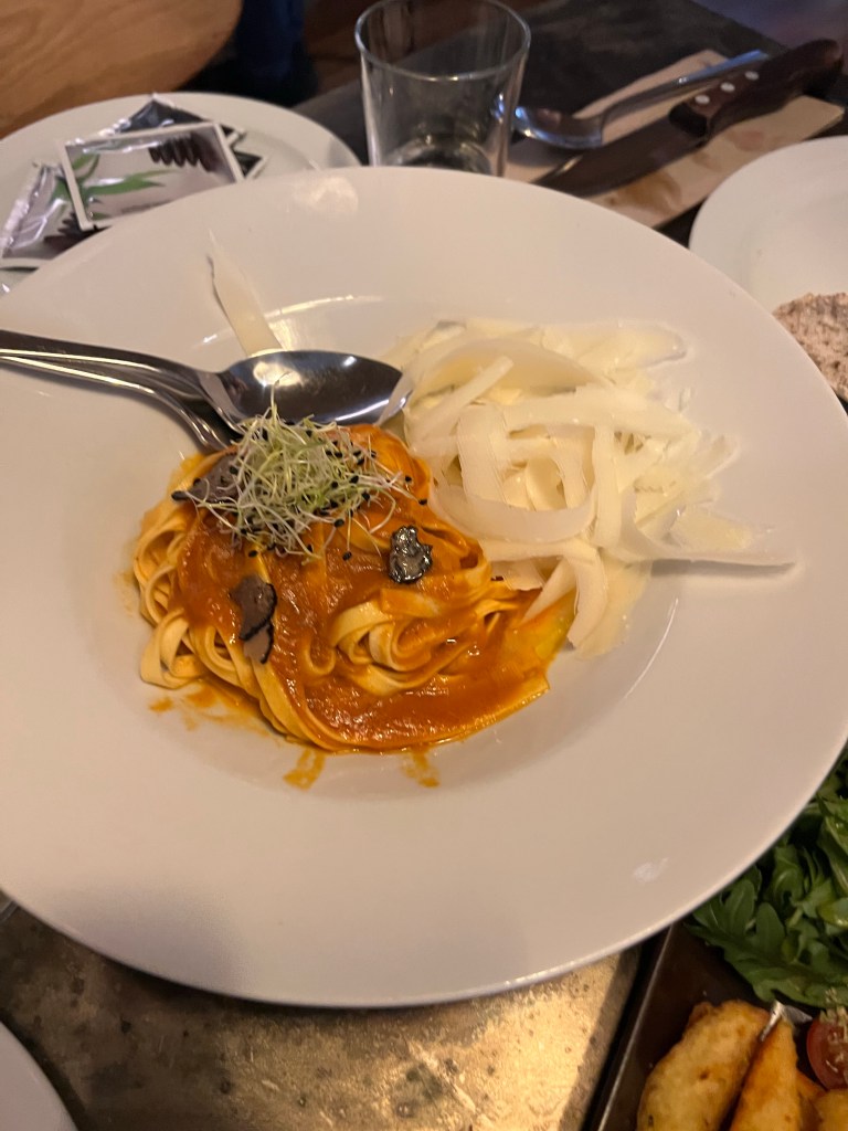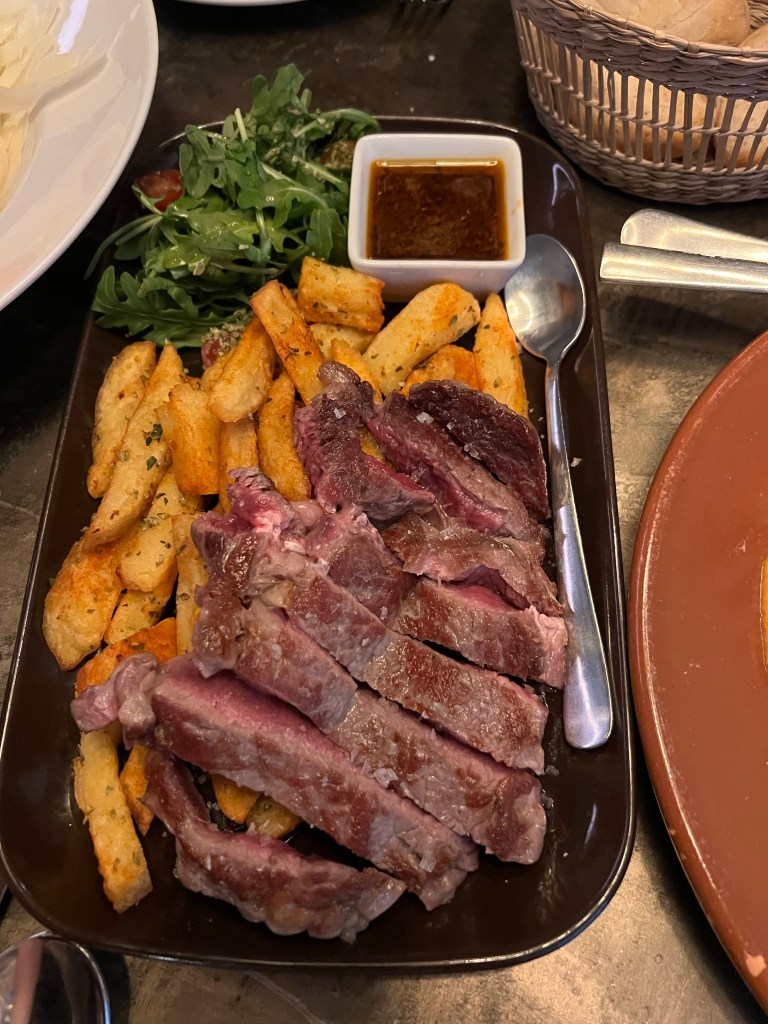 On our first night in Madrid we walked around Plaza de Santa Ana (which is beautiful!) and Plaza Mayor (which was very busy and there must have been a soccer match because there was a lot of hooting and hollering going on!) before making it to our dinner reservation for the evening. Our dinner was at Astor Puerta Cerrada, and this restaurant was wonderful in all the ways you hope for. The service was top notch, the ambience was perfect, and the food was delicious! Astor Puerta Cerrada was our number 1 restaurant experience of the trip! We started with Iberian ham croquettes (of course!) on pea puree, which were amazing , and the Astor Salad, which is an arugula and cabbage salad. For our mains we had Iberian barbecue ribs with roasted pumpkin, Gorgonzola cheese and pistachios, Argentinian ribeye steak and fries with chimichurri sauce, and our third dish was a tagliatelle pasta with truffle and parmigiana sauce. Wow! Soooo good!!! All of it!