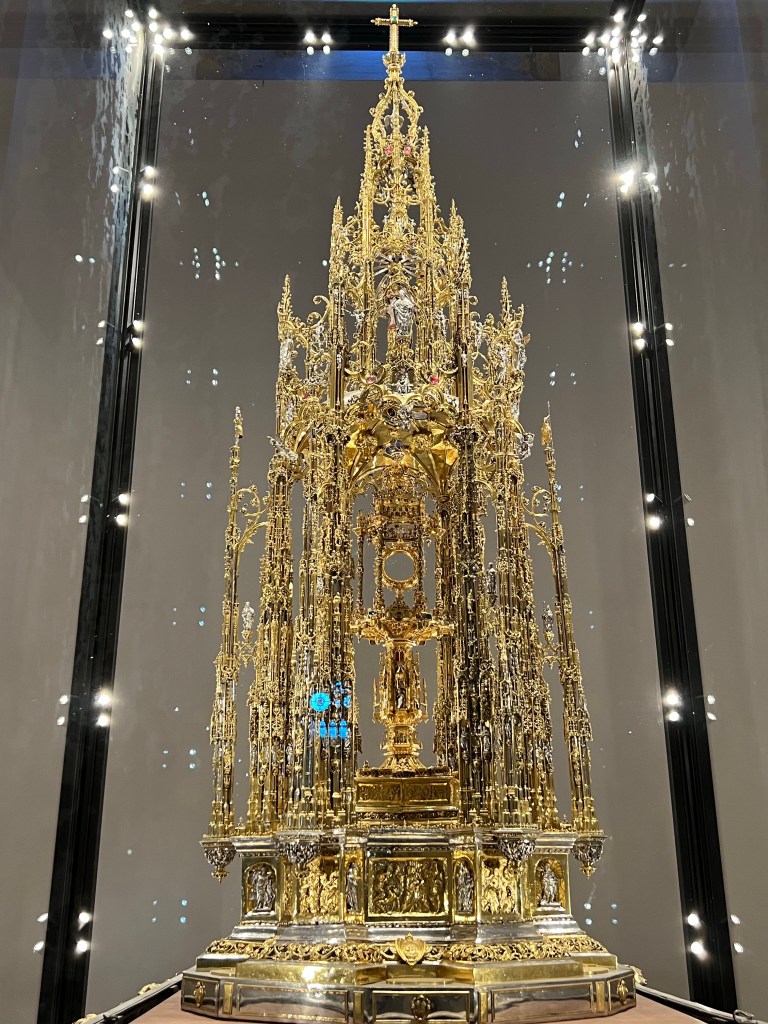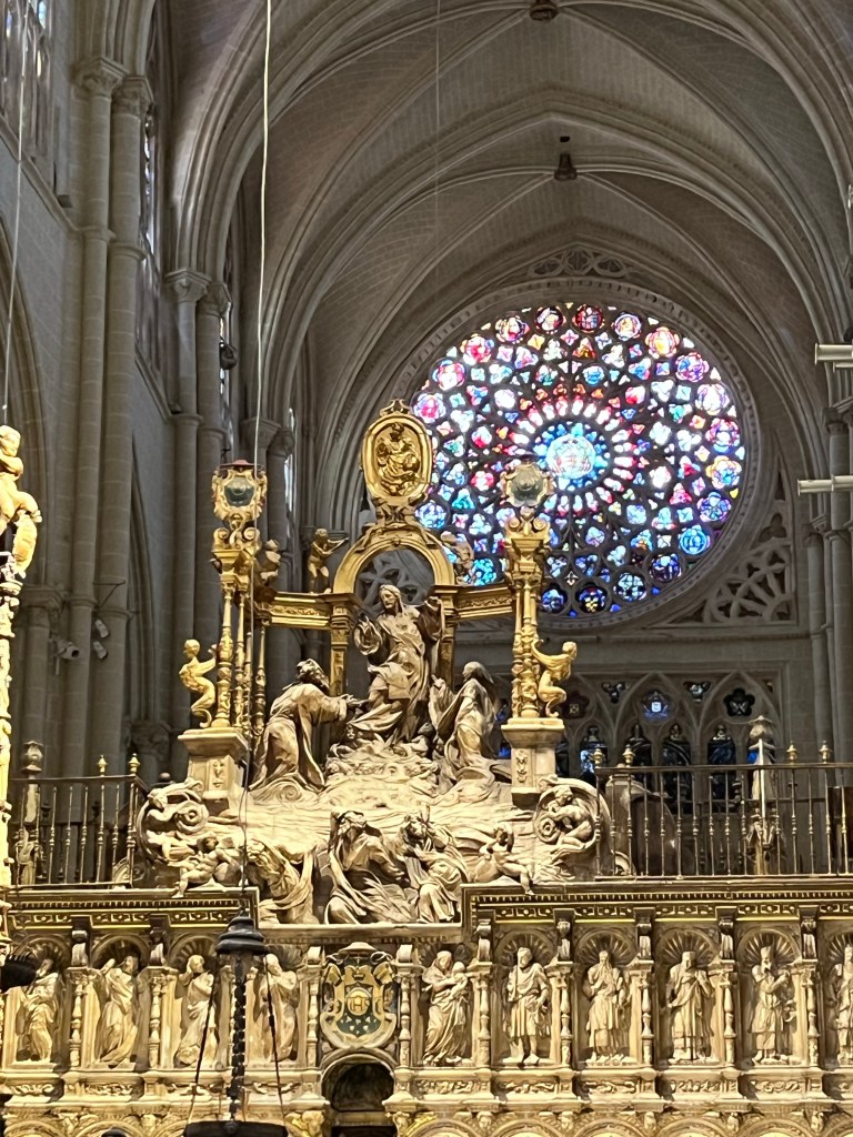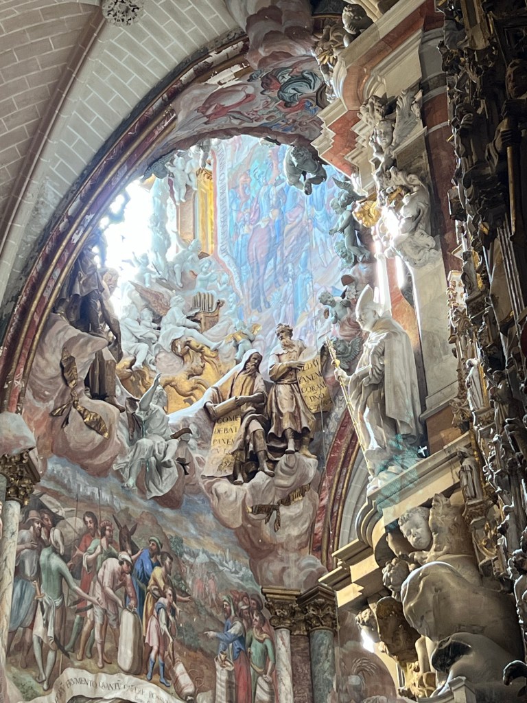 So our first stop of the day was in Toledo. Toledo was a holy place because in the Middle Ages it was a city where Christian, Muslim and Jewish cultures coexisted peacefully. Stop number one is the impressive gothic style Catedral which has many artistic masterpieces, including the monstrance made with 18 kg of pure gold, but my favourite was the Transparente, which is illuminated by a light well carved into the dome above.