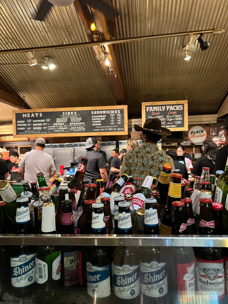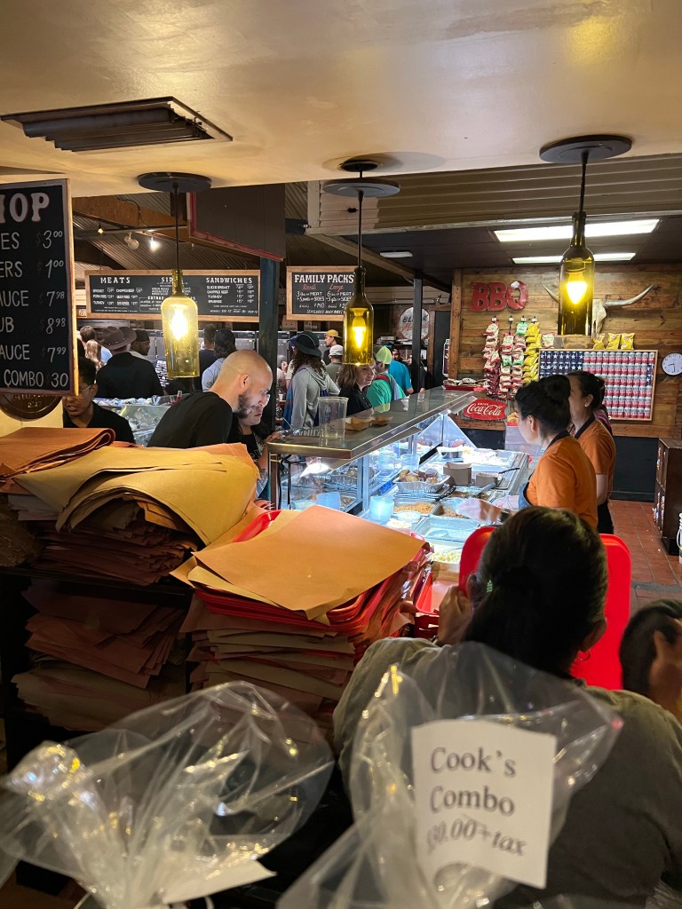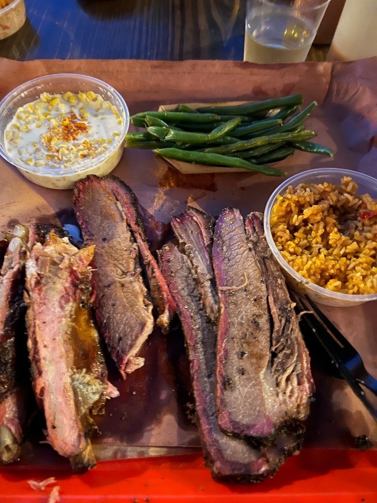 So we finally get inside, and it’s so crazy busy, but the smell is out of this world good. We make it up the the “Sides” area where the staff grab a paper lined tray and yell at you. Like seriously yell “WHAT SIDES DO YOU WANT!?!?!” I’ve never felt so much pressure because up until this point I couldn’t even see the sides menu, so we basically panic ordered . We did not think it through at all. We got 2 orders of Mexican rice, green beans, baked beans, and cream corn. Then you get to the meat station and the guy (a little bit more relaxed then the sides lady) says what do you want? And we have decision paralysis, and we like uhhhhh….ribs? And he goes “How many?” so were’ like uhhhhh 4 and some brisket. So he starts slicing off some brisket and then he says “Is that it?” And it felt more like an accusation than a question. Like is that all we can eat, so we asked for more ribs. And again he goes “is that it?” And we’re like, ummmm add some more brisket too. Lol I’ve never felt so challenged before about how much meat I can eat in one sitting! But we’ve got our meat and sides so off we go to find a table out side and enjoy our Texas Barbecue. I’m not kidding when I tell you the ribs were THE BEST ribs I have ever tasted. Like I will no compare every rib to this ribs and I’m sure no other rib will ever taste as good. Good lord! And the green beans and sweet corn were also so delicious. The rice, was just a basic seasoned side rice, but the beans and corn were definitely something I’d get again and again. We had so much fun that we actually shut the place down. Literally. They shut off all the lights and basically said you guys gotta go. Hahaha