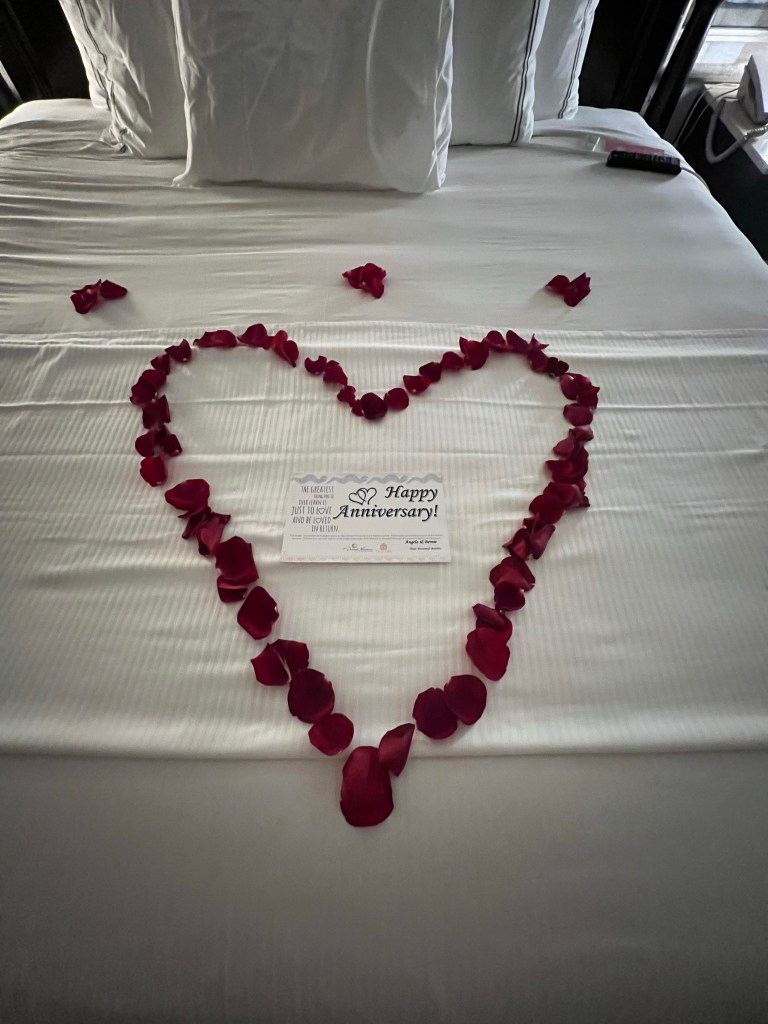 When we got back to our room that night our turn down services left rose petals in the shape of a heart on the bed.