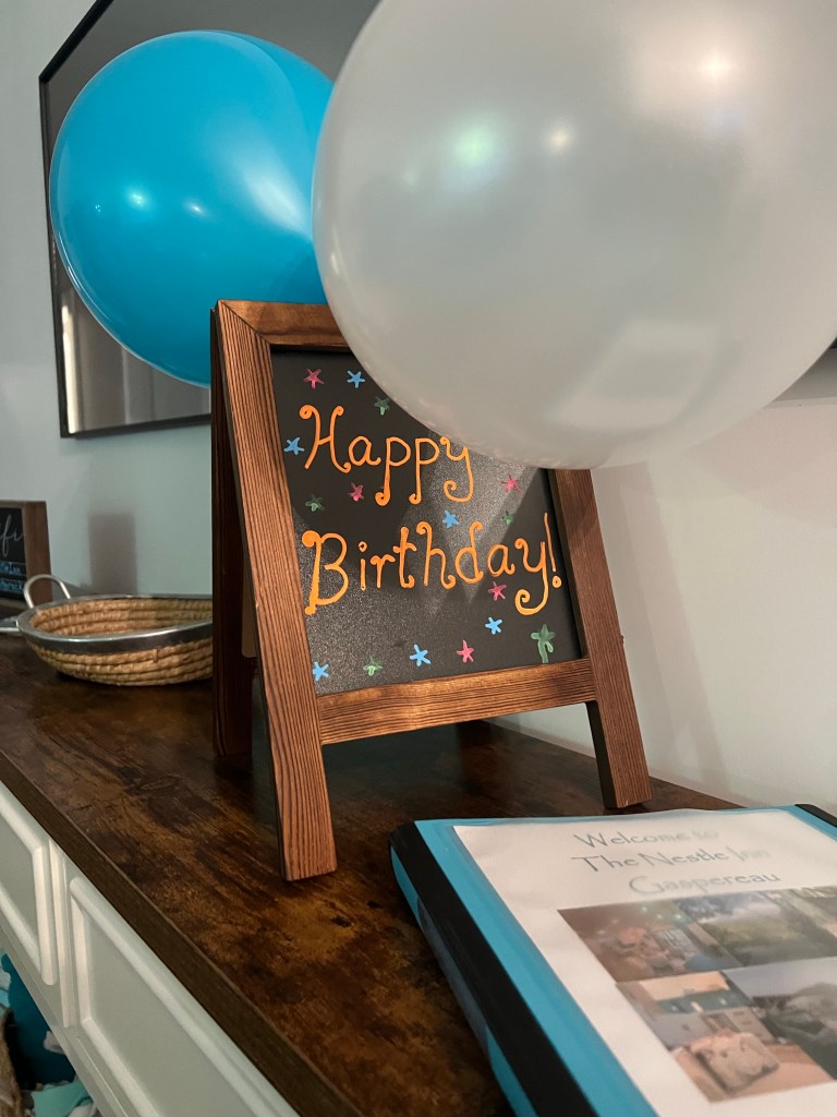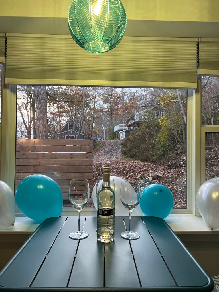 After the tasting we checked in to our AirBnB. We stayed at the Nestle Inn Gaspereau on White Rock Road, across the road from Benjamin Bridge. The owners had a Happy Birthday welcome sign along with balloons and a bottle of Tidal Bay for us. It was a really nice spot for us and we really enjoyed our stay there.