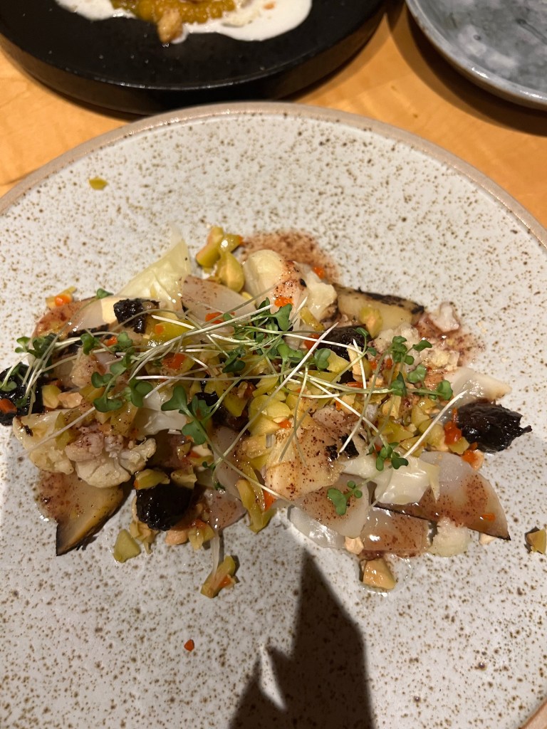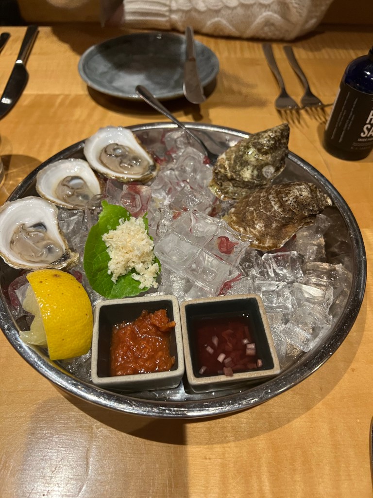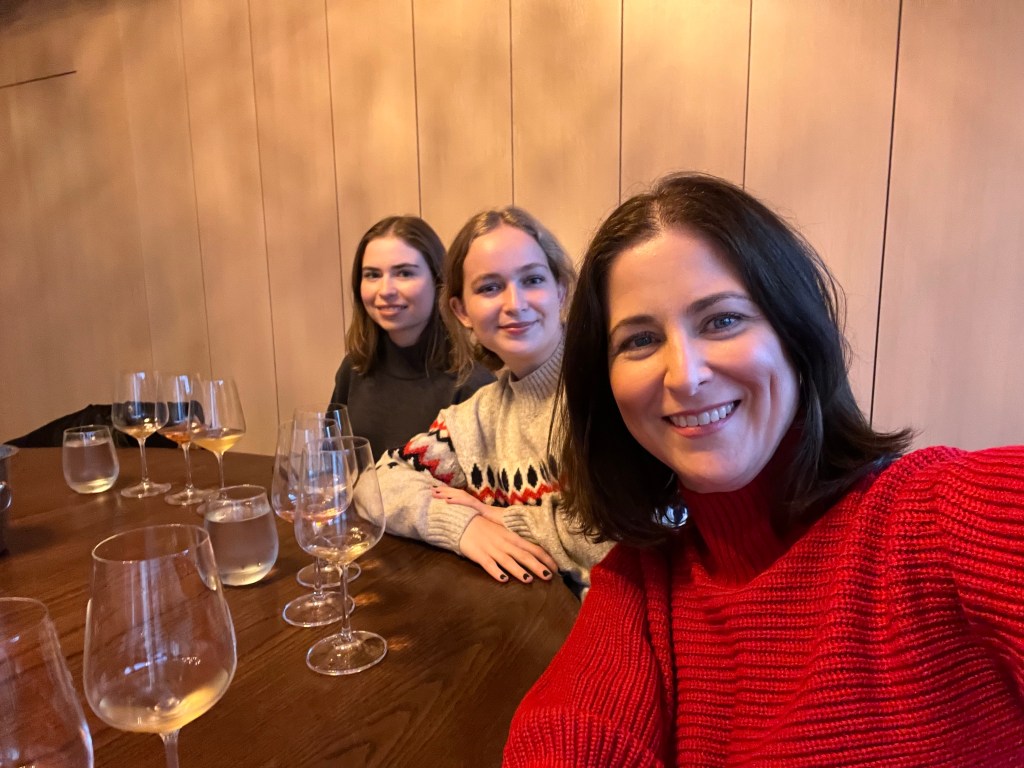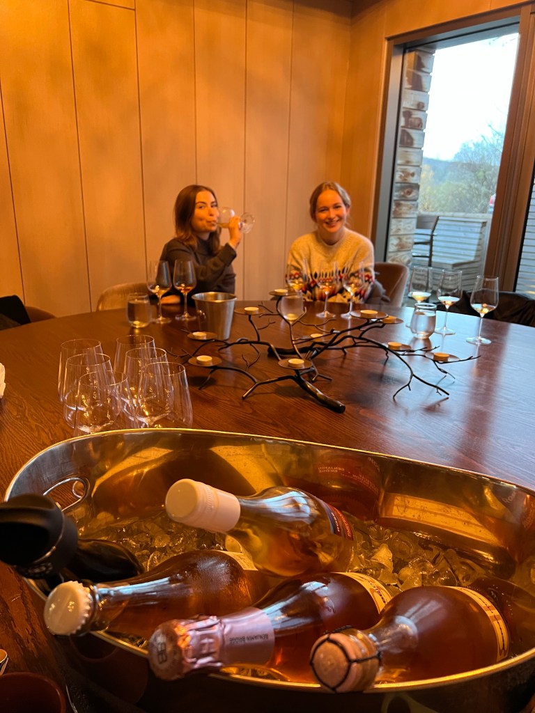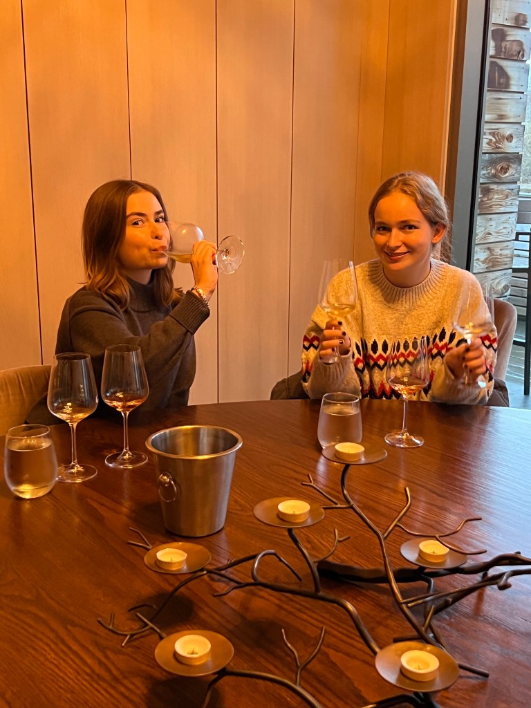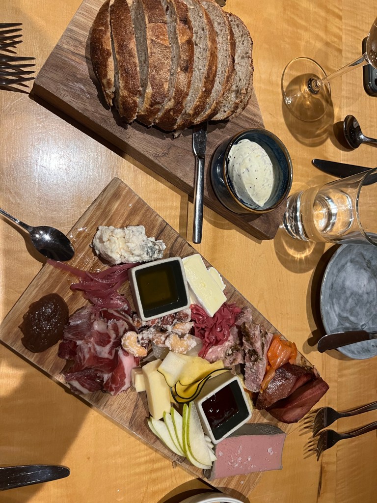 We decided to taxi to our dinner reservation Friday night. We reserved a table at Le Caveau, which is the restaurant on site at Grand Pre Wines. The taxi cost $25 one way (so $50 round trip plus tip). Stephen and I had lunch on the outdoor terrace there a few years ago and we both loved it so I was excited to go again with the girls. But this time the vibe was NOT vibing. We obviously were dining indoors this time, and the ambiance was just really lacking. The lights seemed to be set on ultra bright. There were only a few dinners there, and it just felt….dated. Our server was the highlight of the night. He was amazing and very entertaining. He even sat down and chatted with us for a bit! We decide on having girl dinner, which was basically one of all the appetizers on the menu. The charcuterie board was not to our tastes. We like more of a cheese, pickle and salami/ prosciutto type of charcuterie. This one is very fois gras and pate, smooshy meat kind of board. The caramelized parsnip soup was the star of the show! We definitely recommend the parsnip soup. The charred brassicas was not how we expected, we thought it would be a warm dish, but it is served cold like an antipasto style. The pumpkin gnocchi was also very good.
