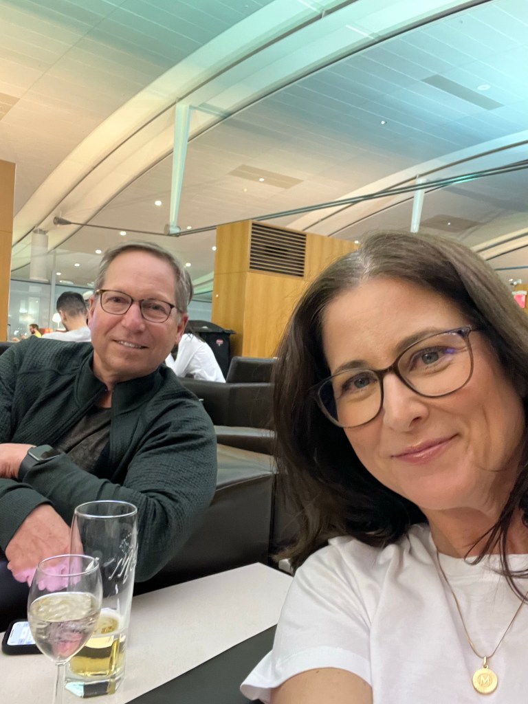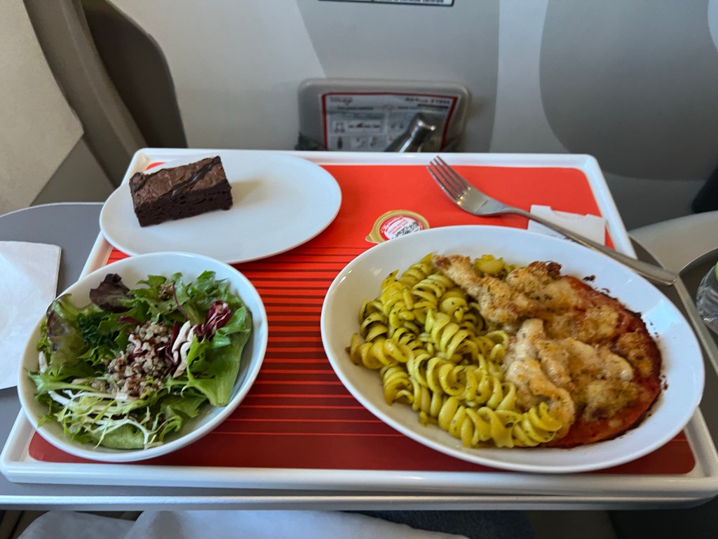We got upgraded to business class (thanks Aeroplan perks!). There was crazy turbulence on our flight. It was a a surprise that our flight attendant was able to serve us a meal. But it was great service despite the rocky conditions. We had generous amounts of wine. A green salad with quinoa. Chicken pasta and a brownie for dessert.