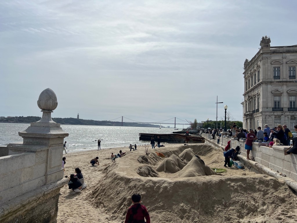 We finally made it to the main square, Praca do Comercio. This square is BIG! At the centre of the square is the statue of King Jose. Of course we also had to go straight down to check out the water too. Stephen had to do some boat watching lol. There is actually a decent amount of beach area here. And there were some adventurous people actually swimming in the water! Hard pass for me! And some very talented sand sculptures.