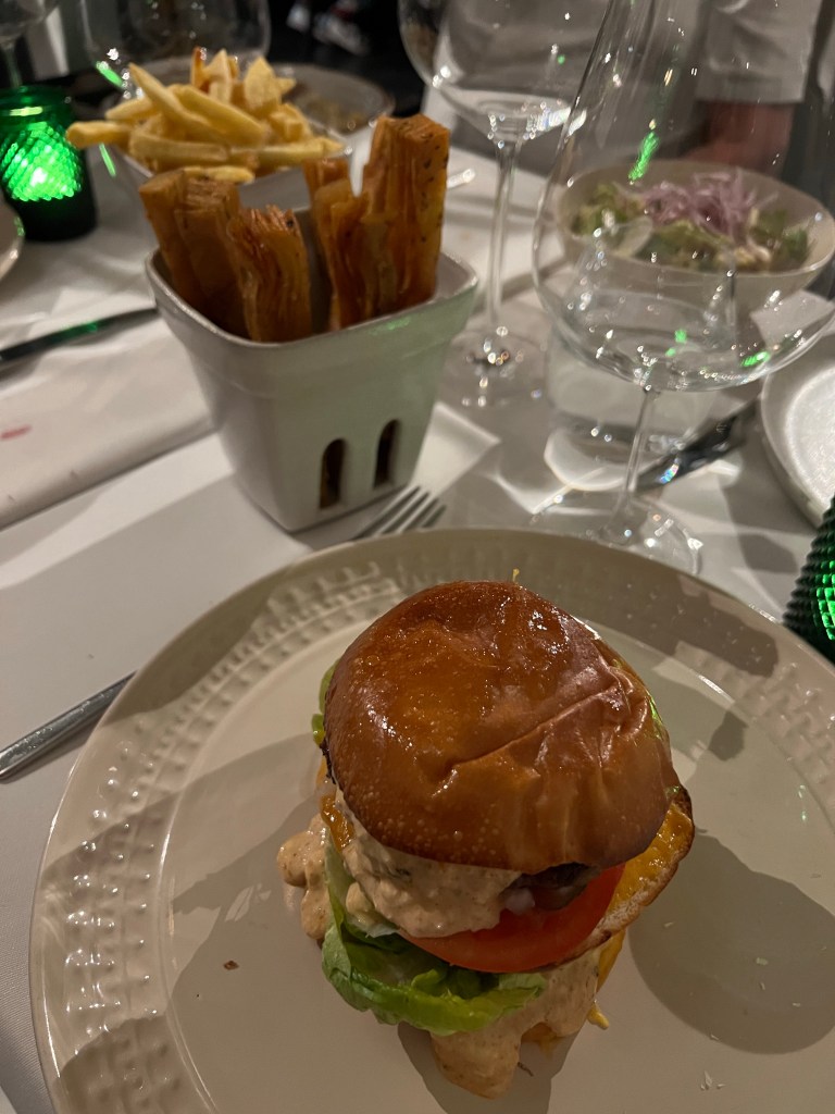 Tonight we’re meeting up with Stephen’s cousin and her partner who travelled from London to spend some time with us in Lisbon. We had quick little drink in our hotel room before heading to our dinner reservation at 100 Maneiras. What a a unique spot. Kind of eclectic and a bit out there. Our server was great and the sommelier was awesome. A bit pricey. But the food was good. We had a beetroot tartare (delicious) and Spinach Burek and Yogurt Sauce (good). For our mains Stephen had the mushroom pappardelle (he loved it) and I had the burger and truffled potato mille feuille. (Burger was good, I didn’t love the potatoes)