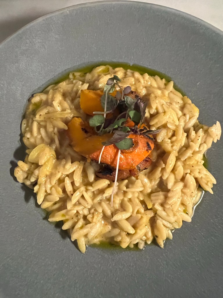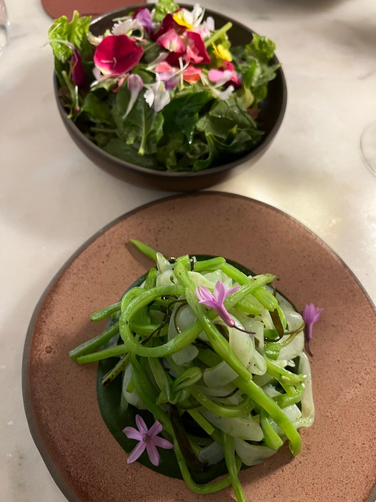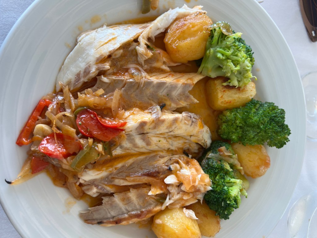 For dinner tonight we’re back in Lisbon and went to Bahr Terrace. I loved it here. Stephen was still a bit grumpy from our long touring day so he didn’t enjoy his night as much as I did. For starters we shared piri piri chicken with remoulade sauce and an order of tuna sashimi. And for mains I ordered a beautiful green salad and an order of grilled squid with runner beans, turnip tops and seaweed. (Sounds disgusting but I loved it) Stephen ordered a pumpkin risotto.