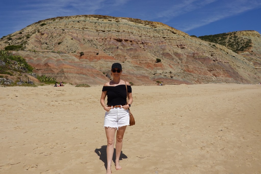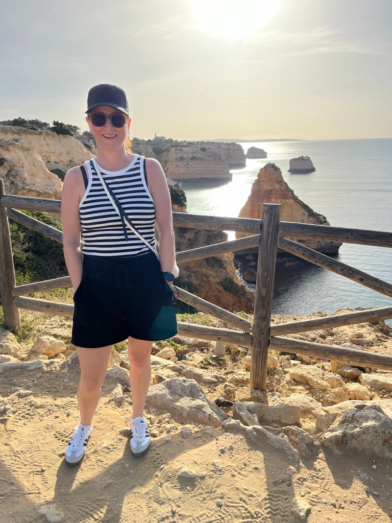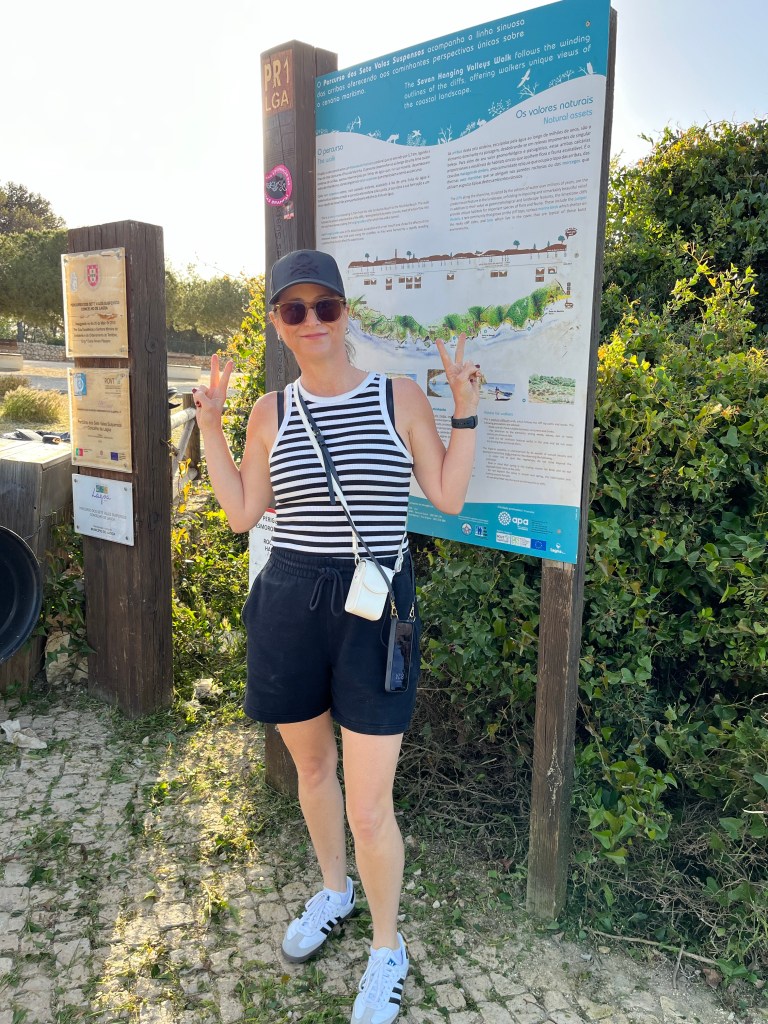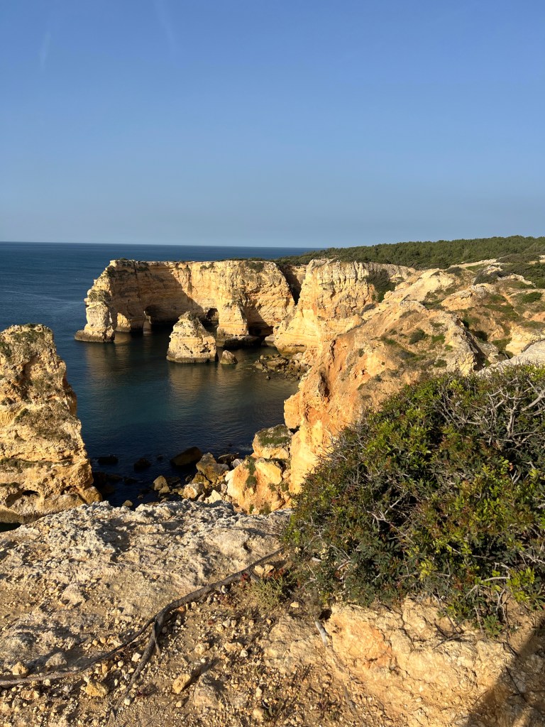 This morning we are on a big adventure! We’re hiking the Seven Hanging Valleys Trail. The Seven Hanging Valleys Trail follows the winding outlines of the cliffs, offering walkers unique views of the coastal landscape. We were up at sunrise and drove to Praia da Marinha. We were the only car in the parking lot at this early hour! We chose to start at this location because we read that there is good parking here. Which there was. And off we go! It was a little chilly initially, but we got warmed up pretty fast! The nice part about starting the hike early in the morning was that we felt like we had the trail to ourselves for most of it.