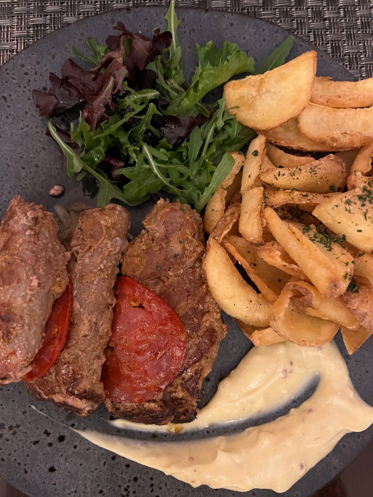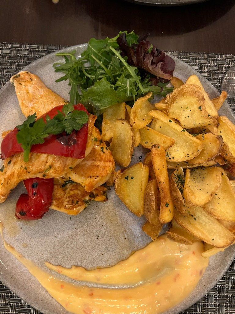 Dinner tonight was at Casa do Prego which is a fun spot with modern take on Portuguese foods. For starters we got the Picatum (seared tuna chunks) and Pica Pau (stir fried beef with garlic and mustard sauce). The Pica Pau was our favourite out of the 2 dishes. For mains I ordered the Guia (grilled chicken breast marinated in coriander and lime, served with grilled peppers and sweet chilli mayo). And Stephen ordered Evora (grilled pork tenderloin with chorizo, caramelized onions and mustard sauce). Both came with fries, and both were absolutely delicious! We actually couldn’t finish even half of our meal tonight so we asked for doggie bags and plan on having it for our lunch tomorrow!