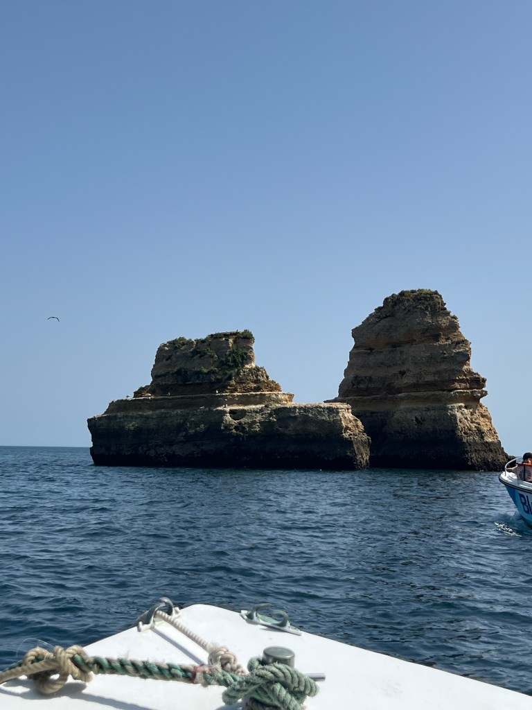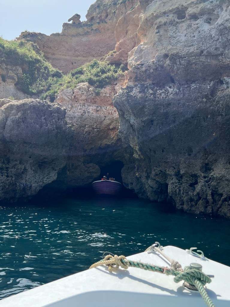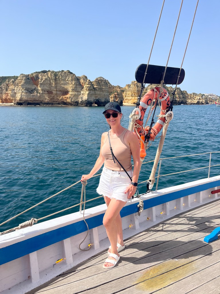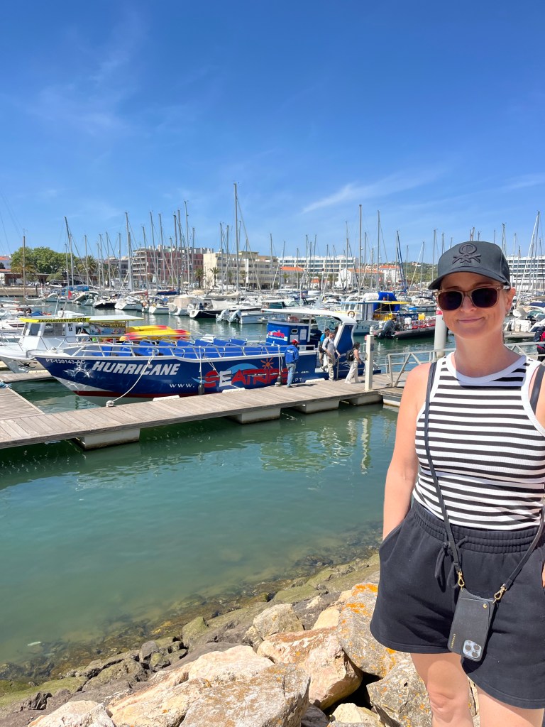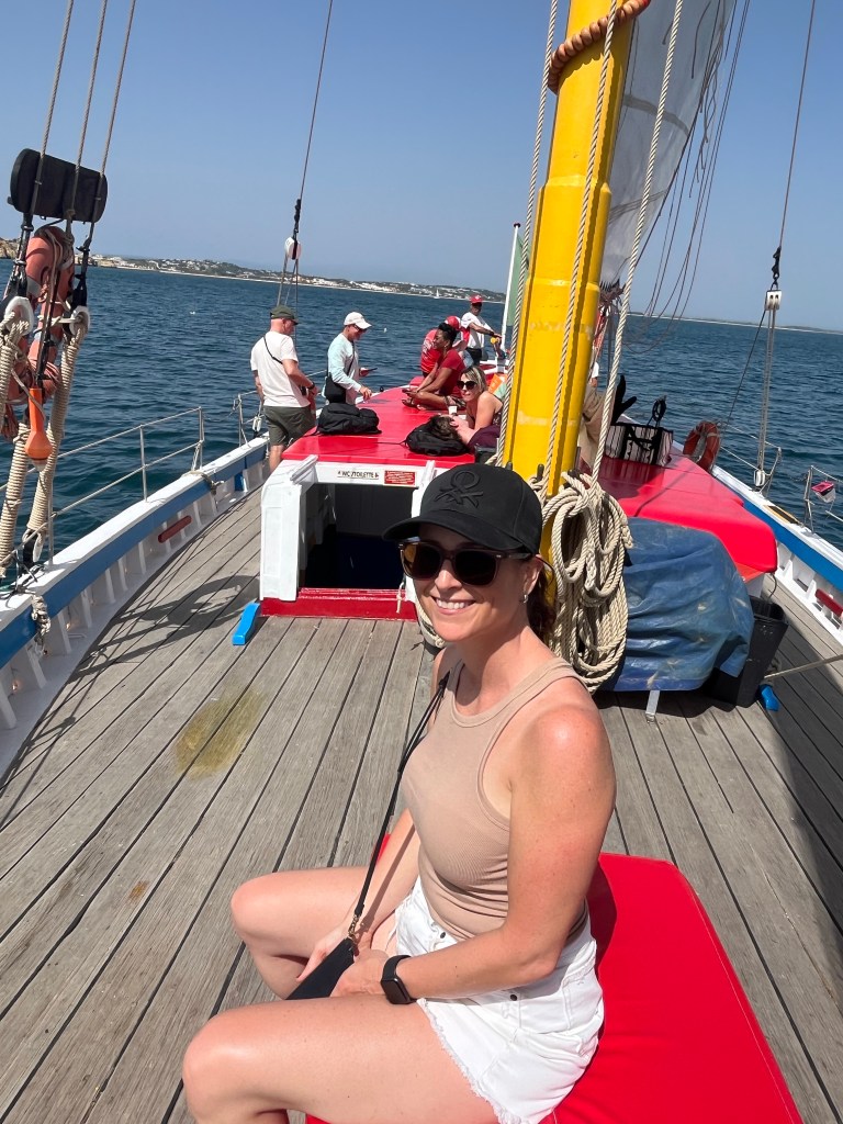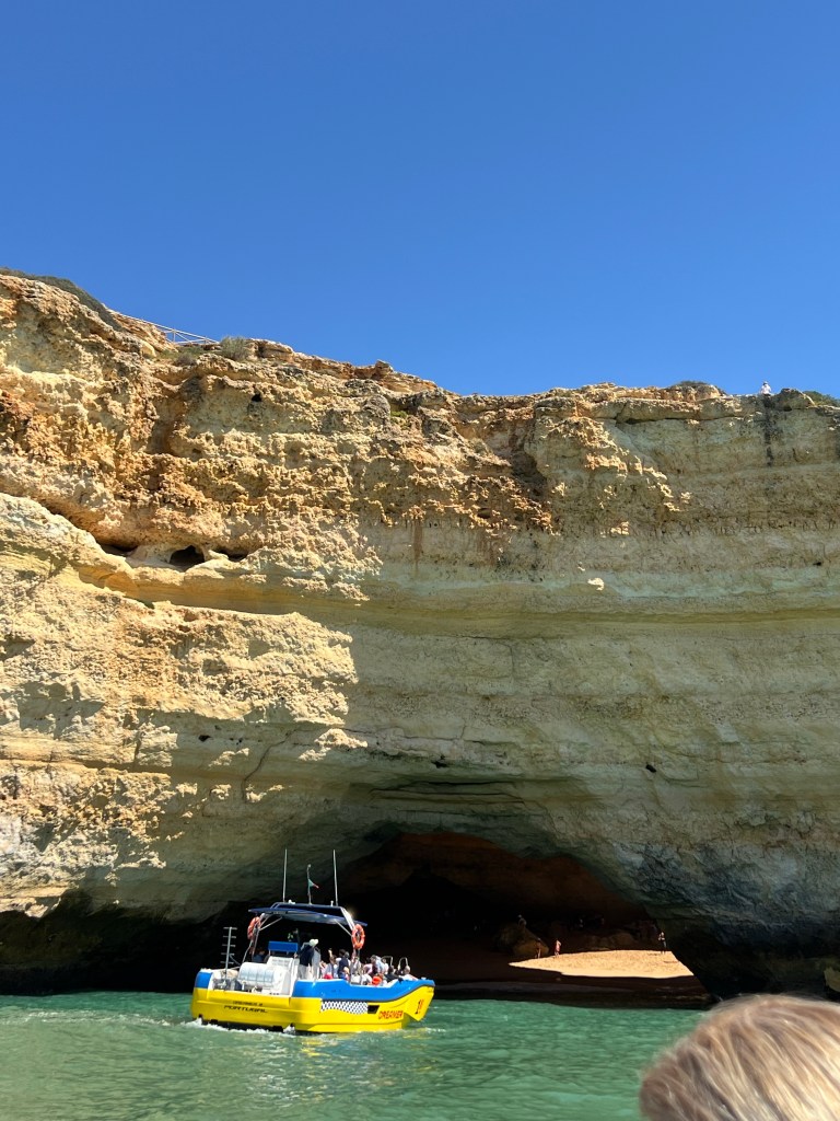 Today we booked a boat tour to see dolphins and the Benagil Caves. This tour is on a larger style boat called a Hurricane, and the unfortunate part was that you get called onboard by name, and we were the last to be called on, and because of this, there were no seats left together so we had to sit separately, which sucked. The other sucky part was that my feet couldn’t touch the floor and so my legs were dangling the whole time which I find super annoying #shortpeopleproblems
