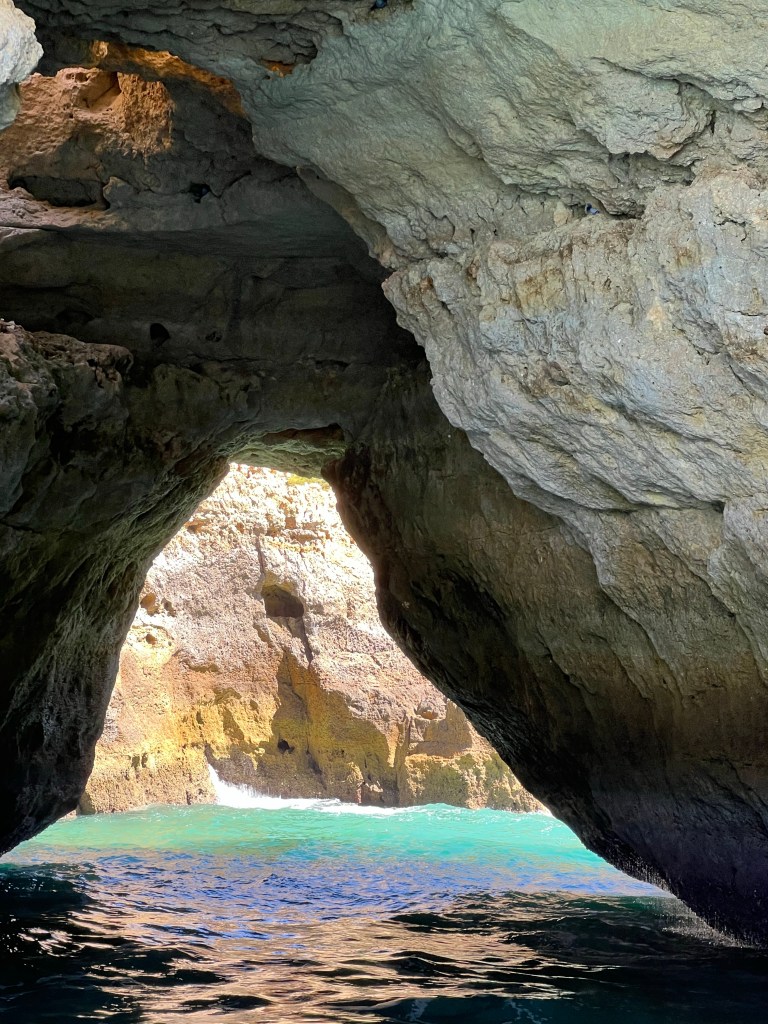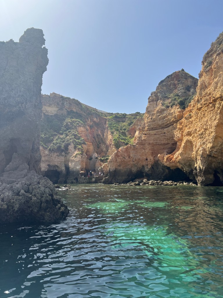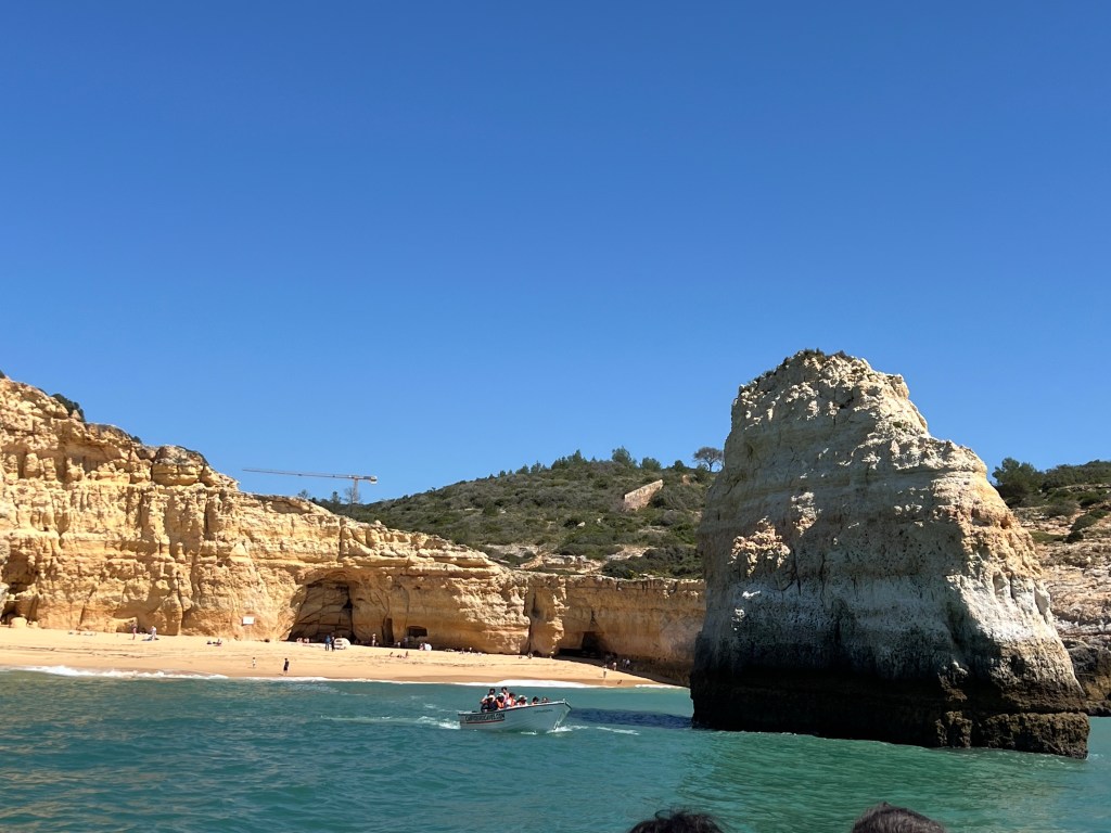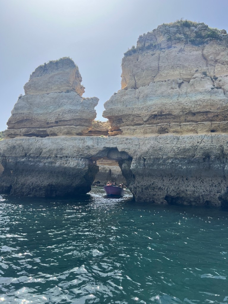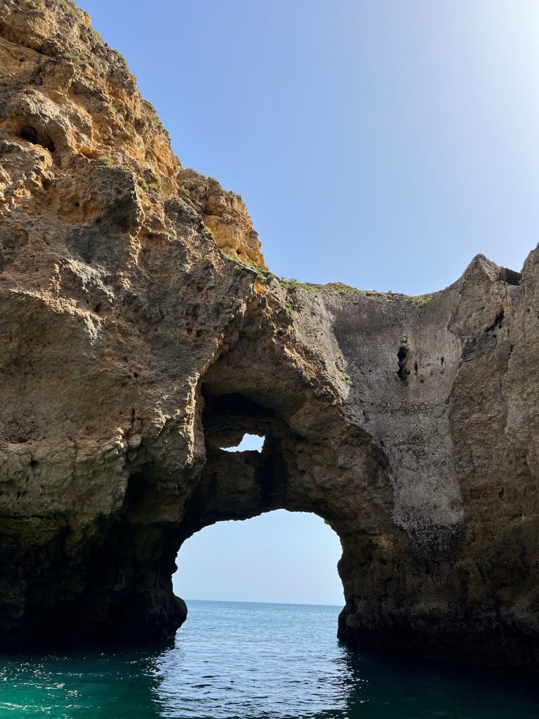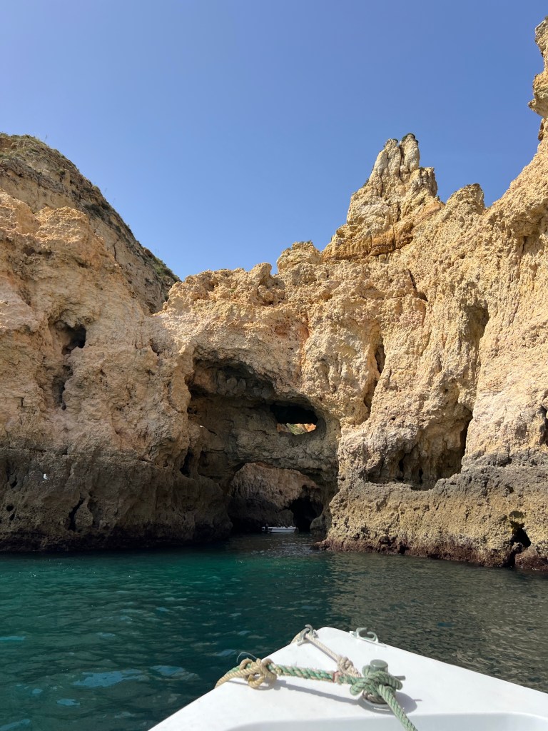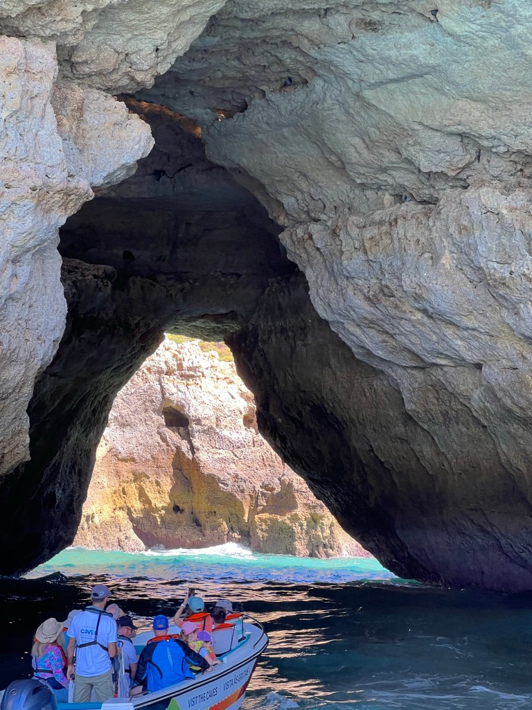 Today we booked a boat tour to see dolphins and the Benagil Caves. This tour is on a larger style boat called a Hurricane, and the unfortunate part was that you get called onboard by name, and we were the last to be called on, and because of this, there were no seats left together so we had to sit separately, which sucked. The other sucky part was that my feet couldn’t touch the floor and so my legs were dangling the whole time which I find super annoying #shortpeopleproblems