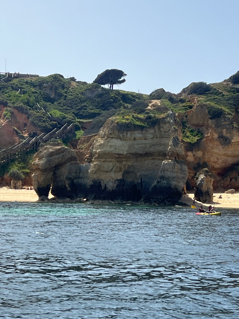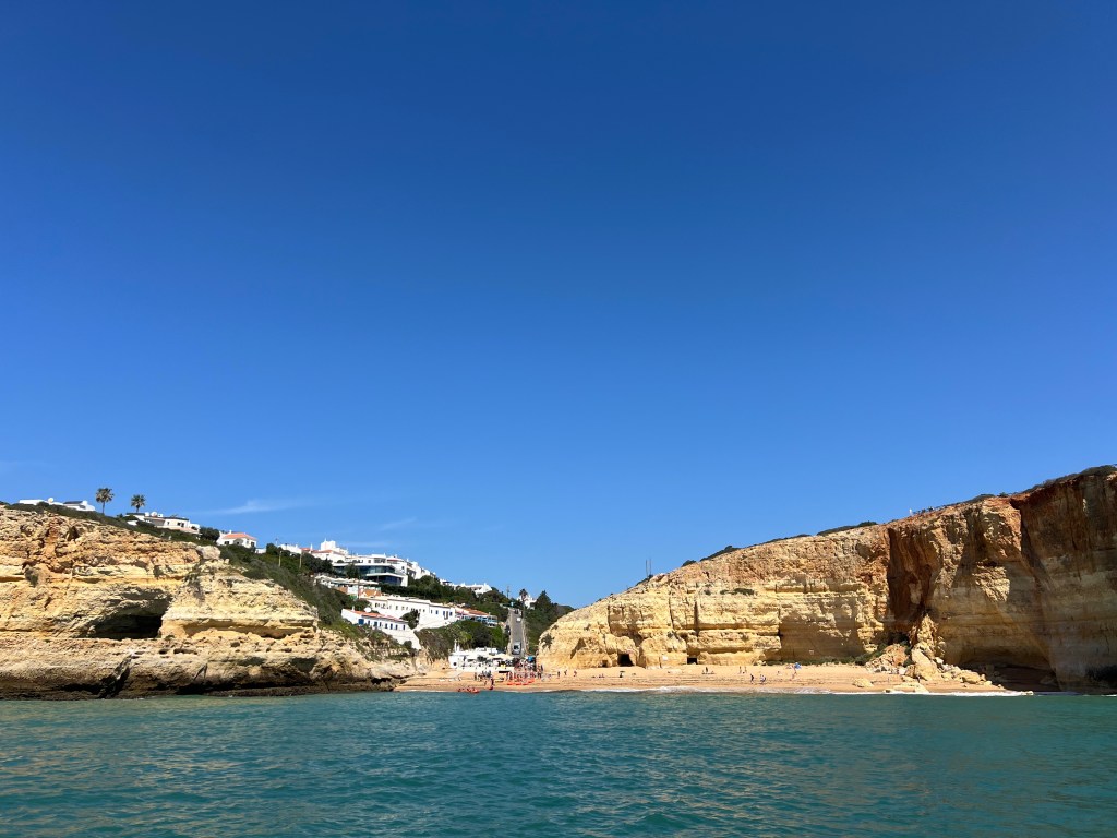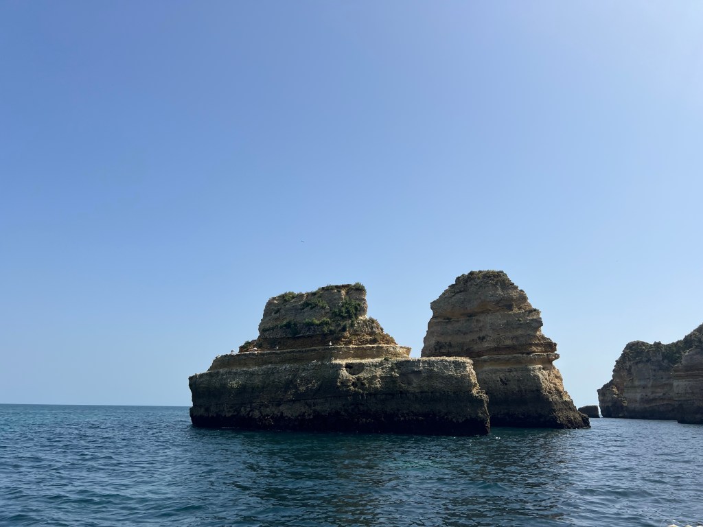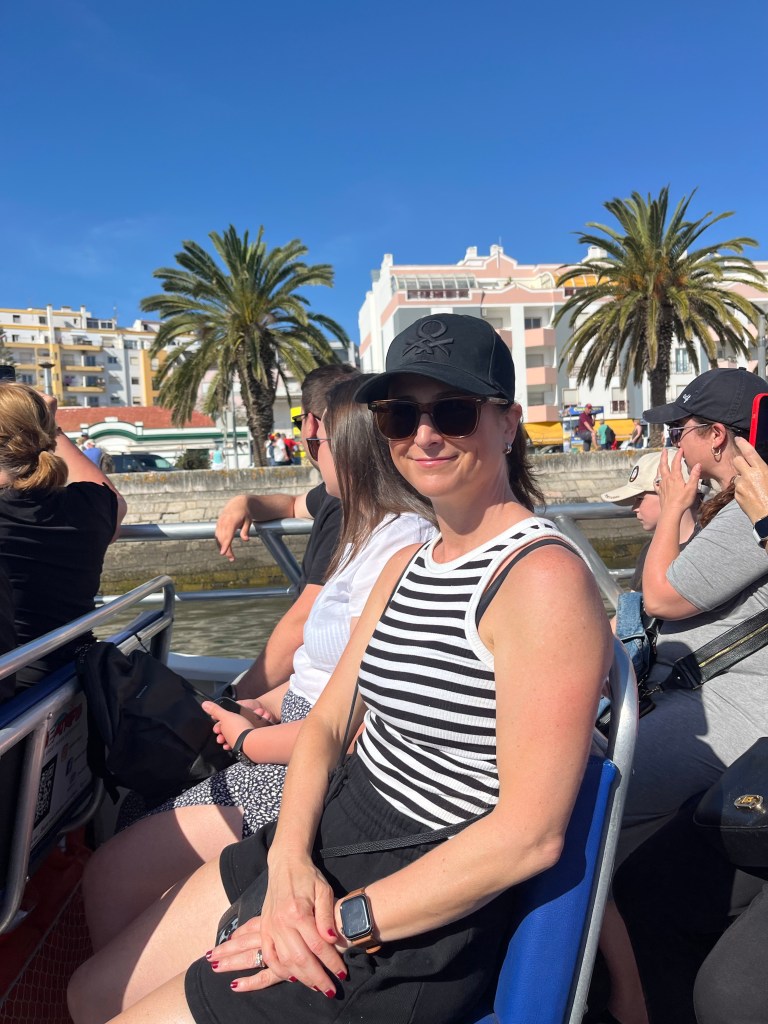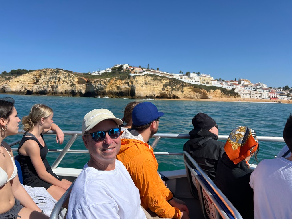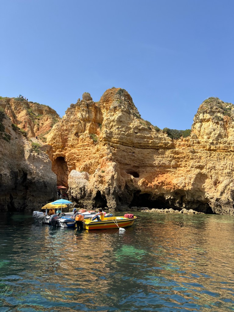 Today we booked a boat tour to see dolphins and the Benagil Caves. This tour is on a larger style boat called a Hurricane, and the unfortunate part was that you get called onboard by name, and we were the last to be called on, and because of this, there were no seats left together so we had to sit separately, which sucked. The other sucky part was that my feet couldn’t touch the floor and so my legs were dangling the whole time which I find super annoying #shortpeopleproblems