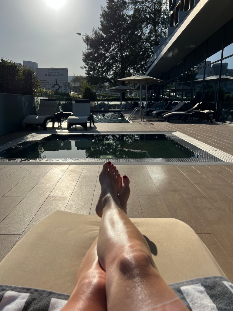 Then we drove straight to the Lisbon Airport. Stephen was stressed about making it on time for the scheduled drop off time. But it all worked out, as it always does. We booked our last night at the Melia Lisbon Airport hotel. It was still a hot and sunny day so we grabbed some lounge chairs by the pool and a drink from the bar and stayed until the sun went down!