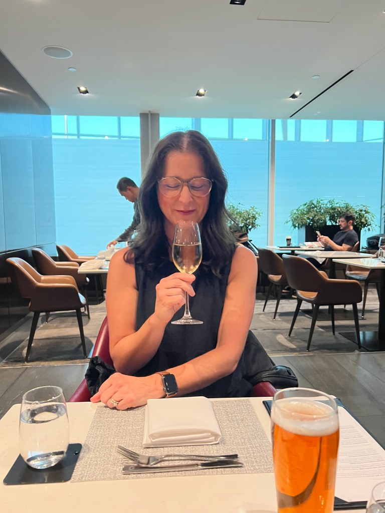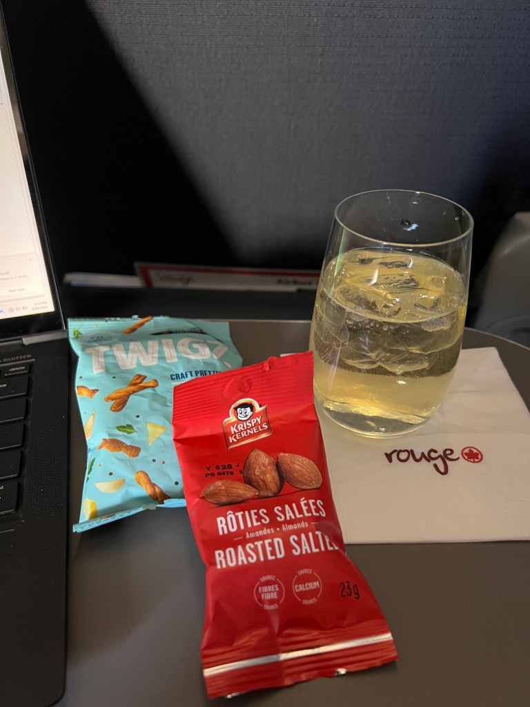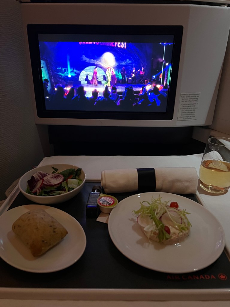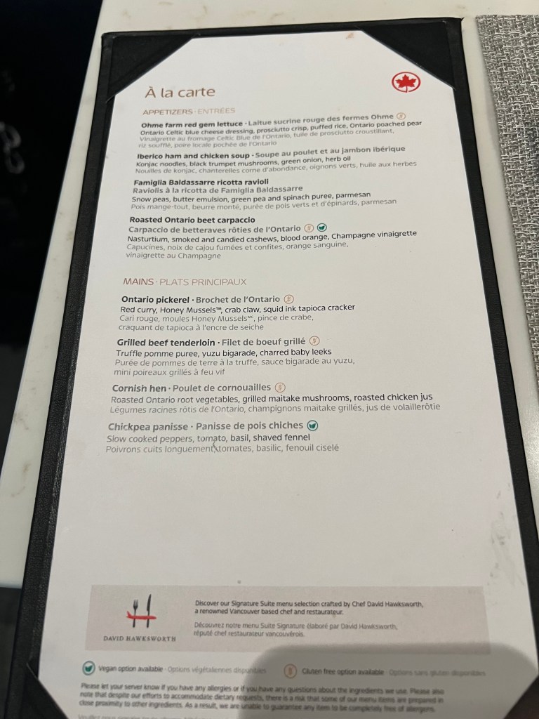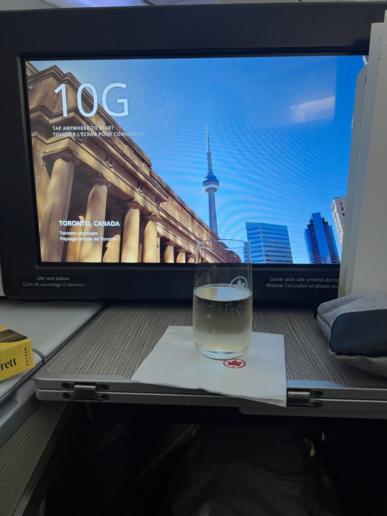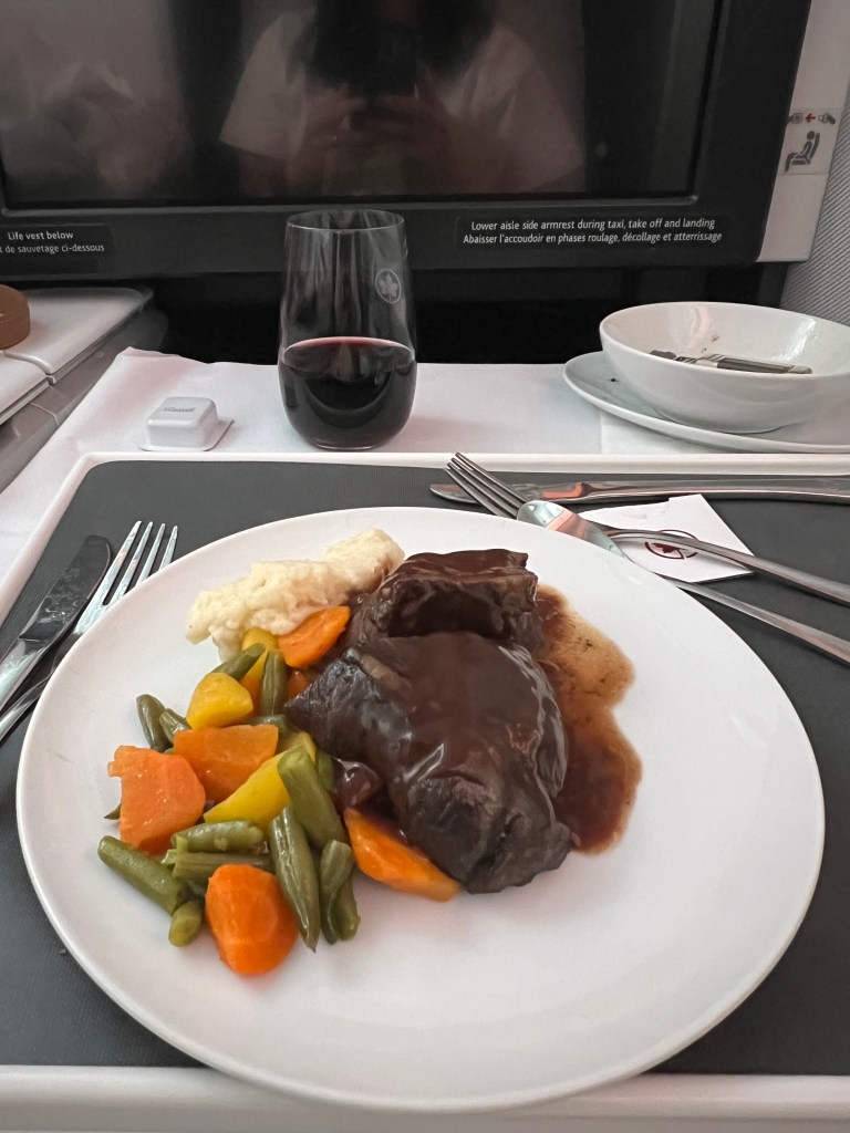 But things were looking up when we landed in Toronto and we figured out that we had access to the Air Canada Signature Lounge! We’d never been to the AC Signature lounge before so we were pretty pumped about it! If you haven’t been, it’s a sit down, full service 3 course meal and the food was delicious! I had champagne (of course!) and the ricotta ravioli for my first course and Stephen ordered the soup. For my main I had the grilled beef tenderloin and Stephen had the Ontario Pickerel. Both were delicious. For dessert I ordered the chocolate cake and Stephen had ice cream and berries.