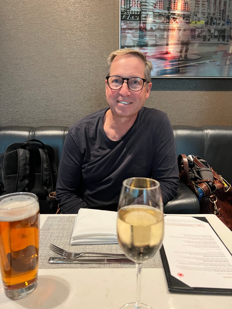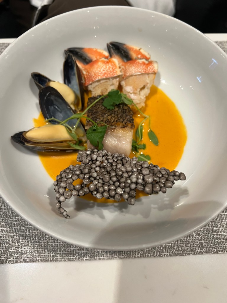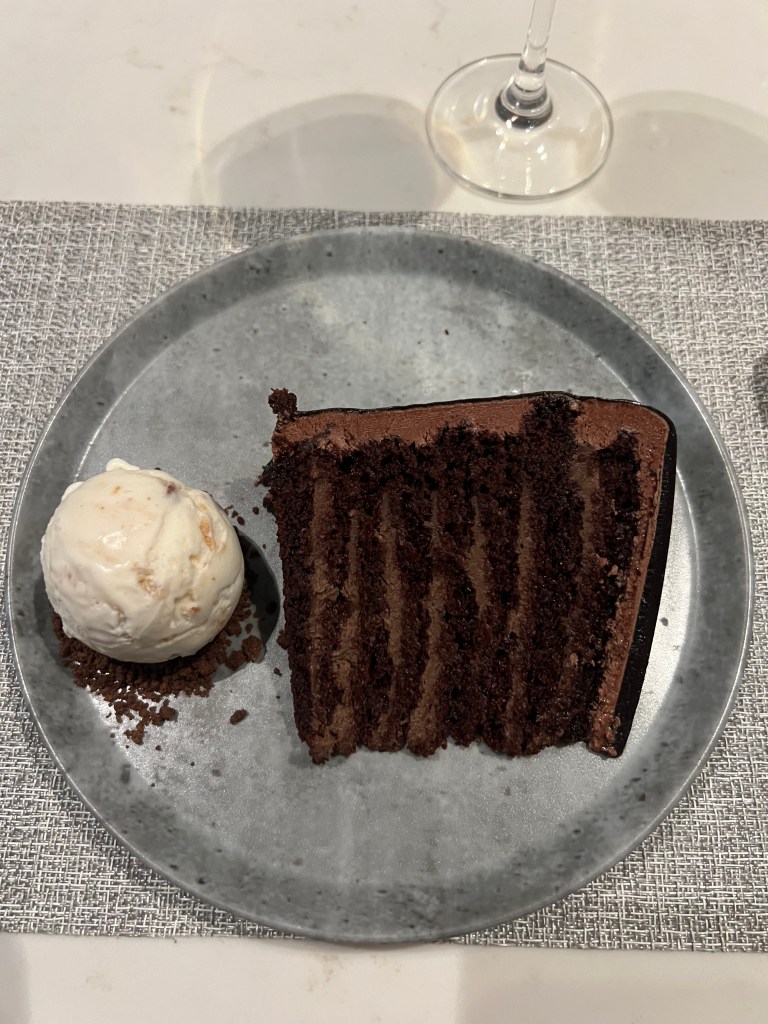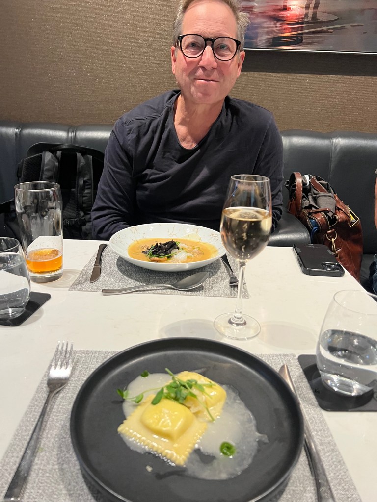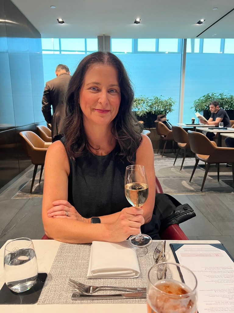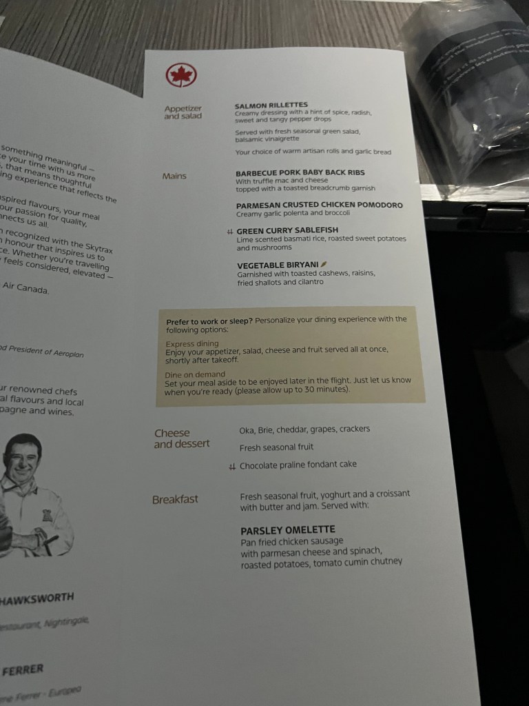 But things were looking up when we landed in Toronto and we figured out that we had access to the Air Canada Signature Lounge! We’d never been to the AC Signature lounge before so we were pretty pumped about it! If you haven’t been, it’s a sit down, full service 3 course meal and the food was delicious! I had champagne (of course!) and the ricotta ravioli for my first course and Stephen ordered the soup. For my main I had the grilled beef tenderloin and Stephen had the Ontario Pickerel. Both were delicious. For dessert I ordered the chocolate cake and Stephen had ice cream and berries.