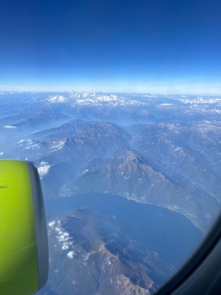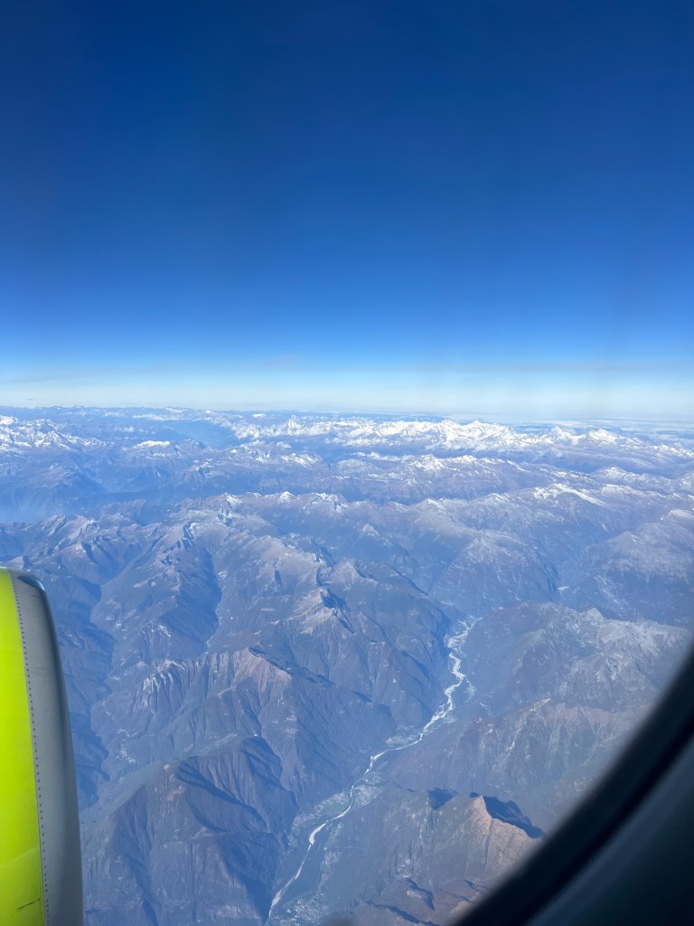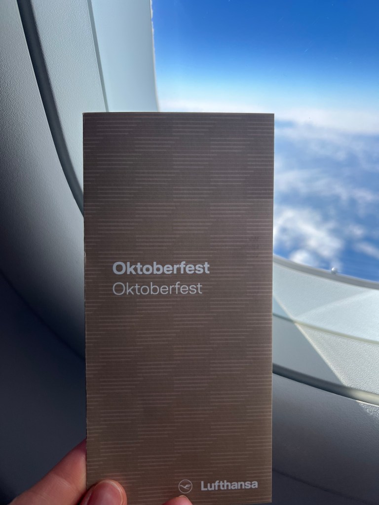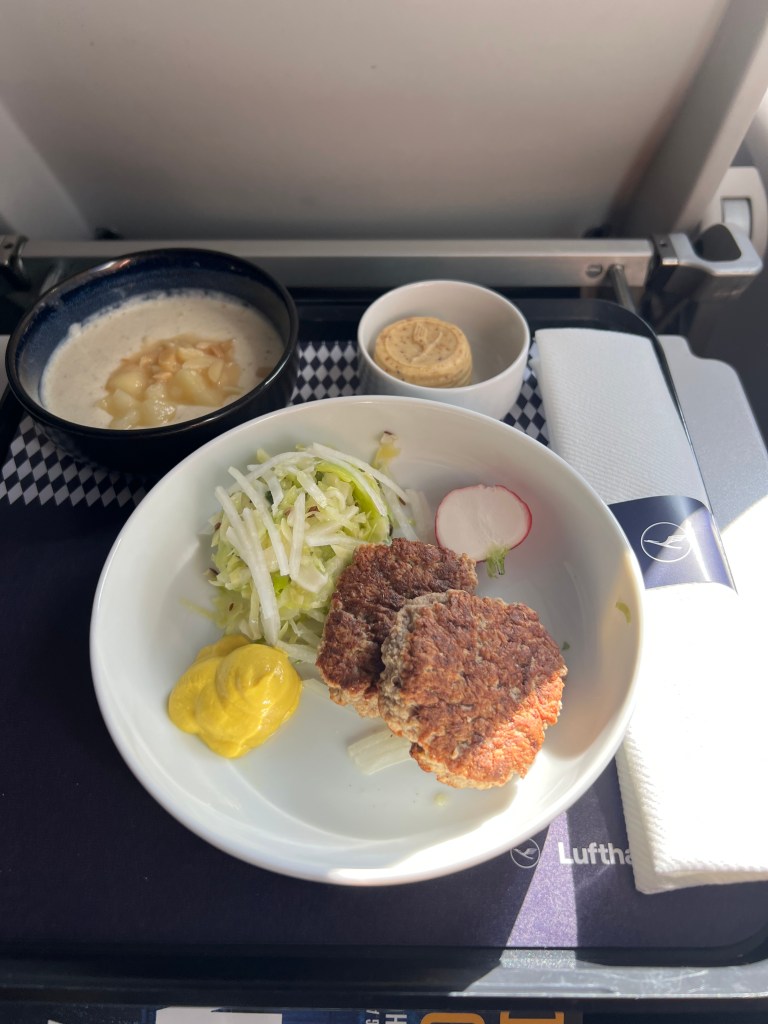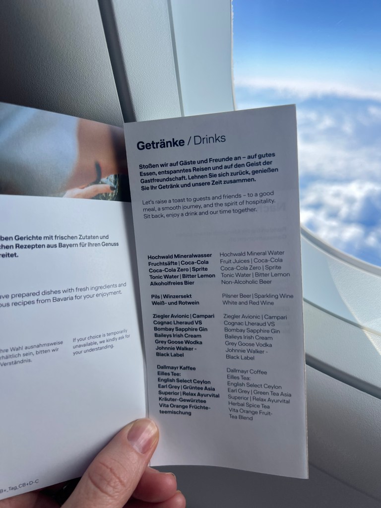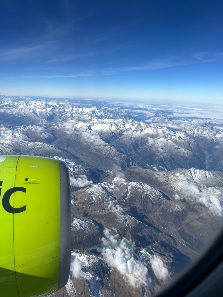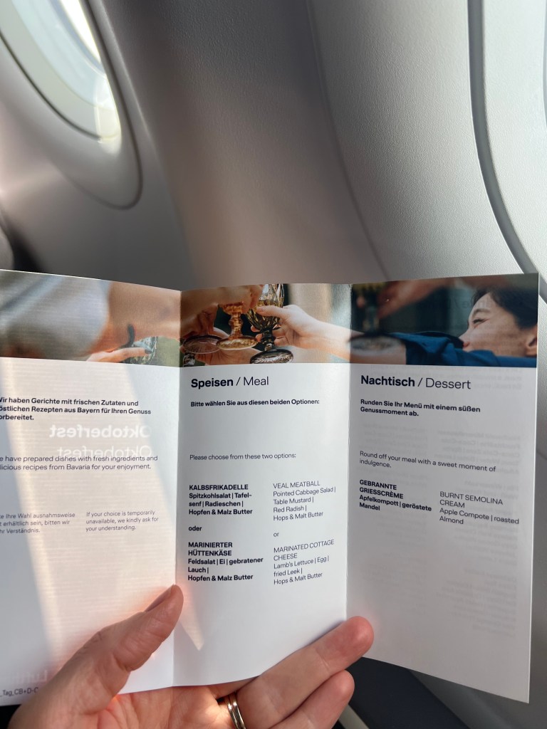 Our connection from Frankfurt to Malta was with Lufthansa, and Stephen sat in Row 1 and I was in row 7. They handed out “Oktoberfest menus” and my expectations were a bit too high. The meal was pretty awful but the views of the Alps made up for the disappointing meal!
