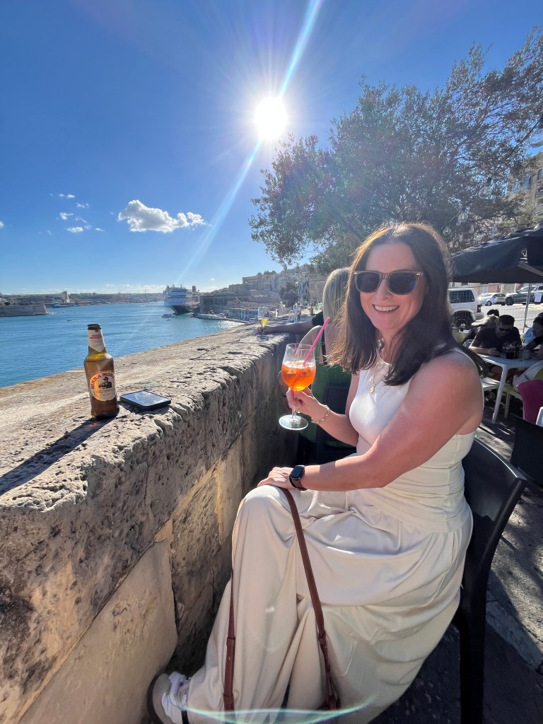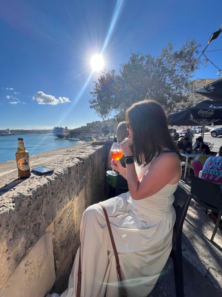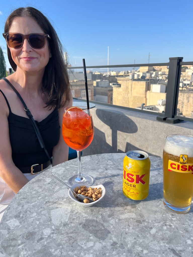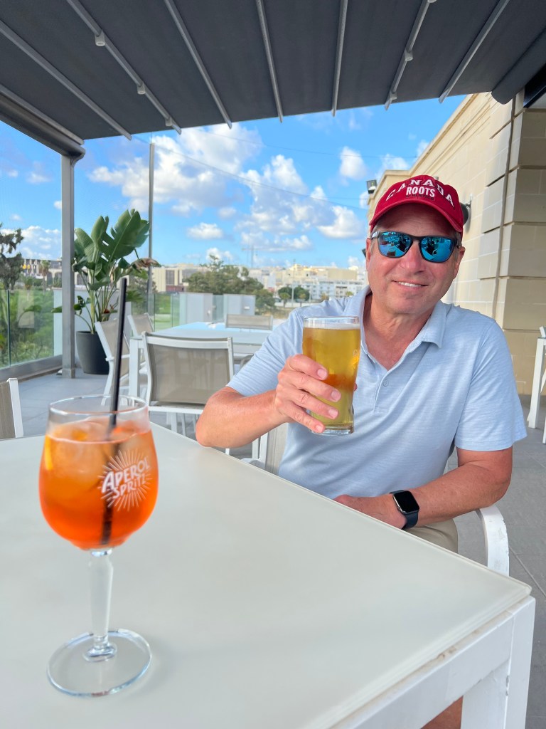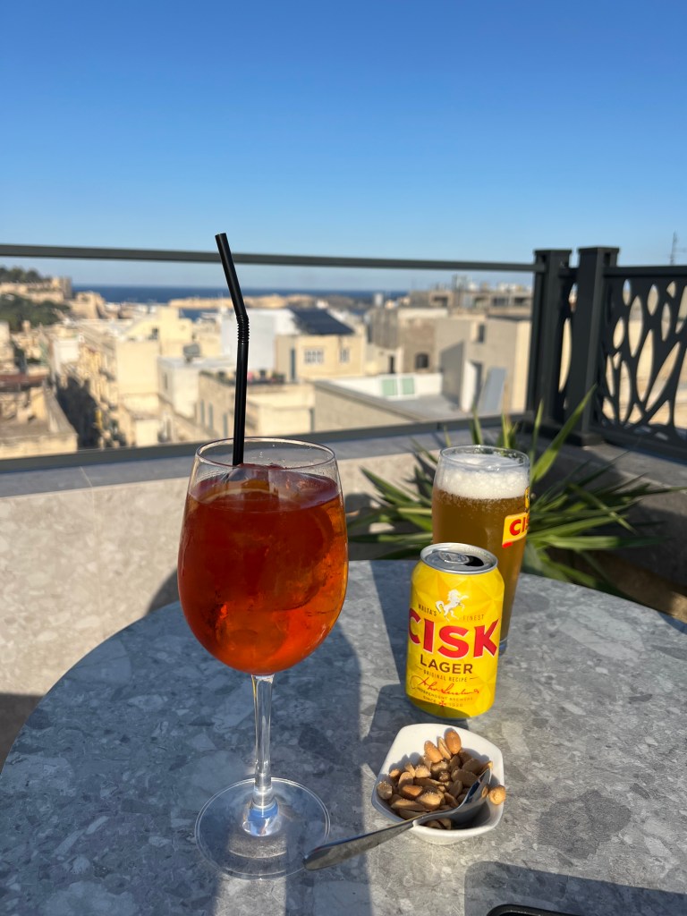 And then Stephen discovered that we were right next to a street bar, so we moved from our park bench to a seat along the fort wall overlooking the Grand Harbour. Stephen had a beer and I had an Aperol Spritz while we enjoyed the last of the afternoon Maltese sunshine.