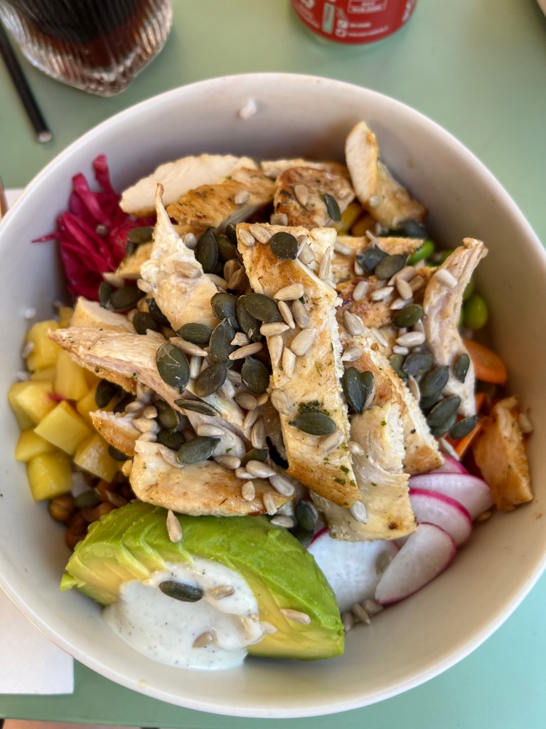 I ordered the Mediterranean Chicken Salad, which had boneless chicken thigh, greens, cherry tomatoes, and seasonal fruits topped with parmesan cheese and lemon vinaigrette. Loved!