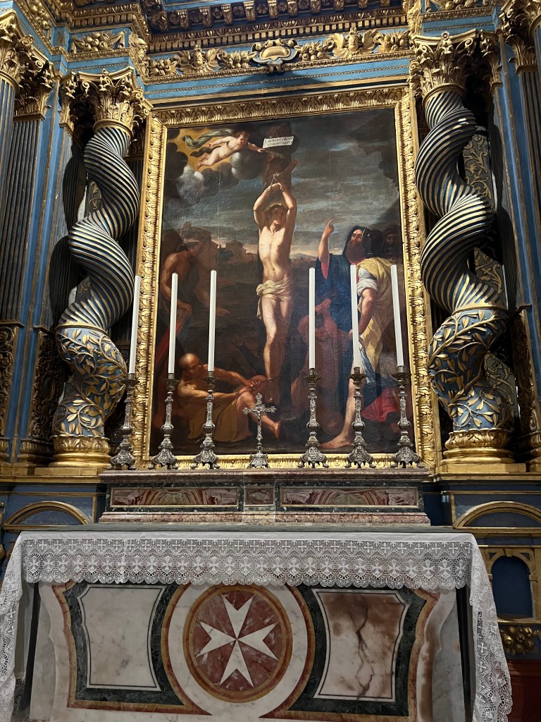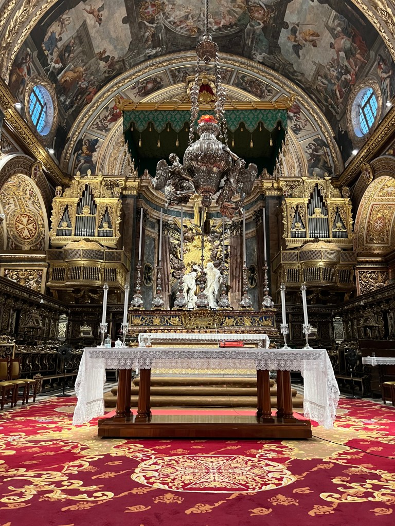 After lunch we went to see St John’s Co Cathedral. The line was pretty long, it took about 20 minutes to get inside. (TIP: pre-book your time the day before online and you can skip the line!) I have been to a lot of churches in my life and this was the first one that actually implemented the no bare shoulders rule. Every person who was wearing any type of a sundress, or tank top had to wear a cover up shawl. No exceptions. But don’t worry if you don’t have something to cover up your scandalous shoulders, they will give you a disposable shawl to wear while you’re in the church.