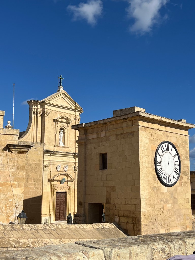 After we unpacked we headed out to explore the walled citadel. Il-Kastell. It’s free to enter and you can walk all the way along the citadel walls to see panoramic views of Gozo. There are churches, museums, and an old prison within the citadel but we chose to walk the walls and read the interpretive signs. The most interesting thing we discovered was that hundreds of years ago, to protect the people of Gozo from raiding Turks, it became customary for the islanders to stay within the walls overnight.