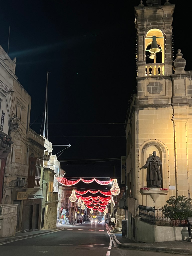 We didn’t have plans for dinner tonight, and after a long day coming from Gozo and golfing in the heat of the afternoon, we didn’t feel like walking into Valletta so we decided to head back to Balzunetta for dinner. The walk was beautiful too ( and there were more fireworks tonight on our walk to dinner!)