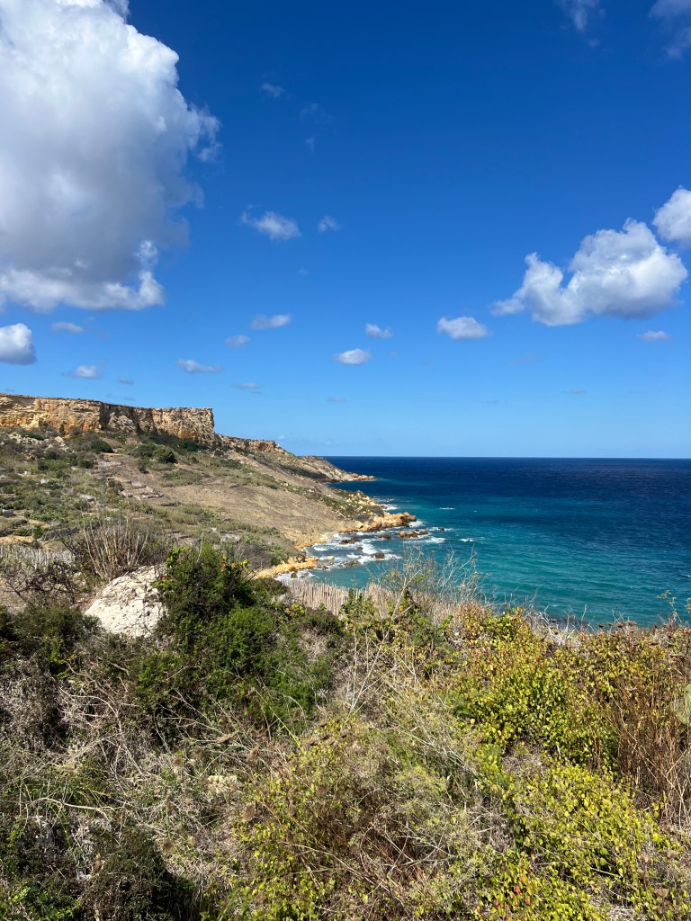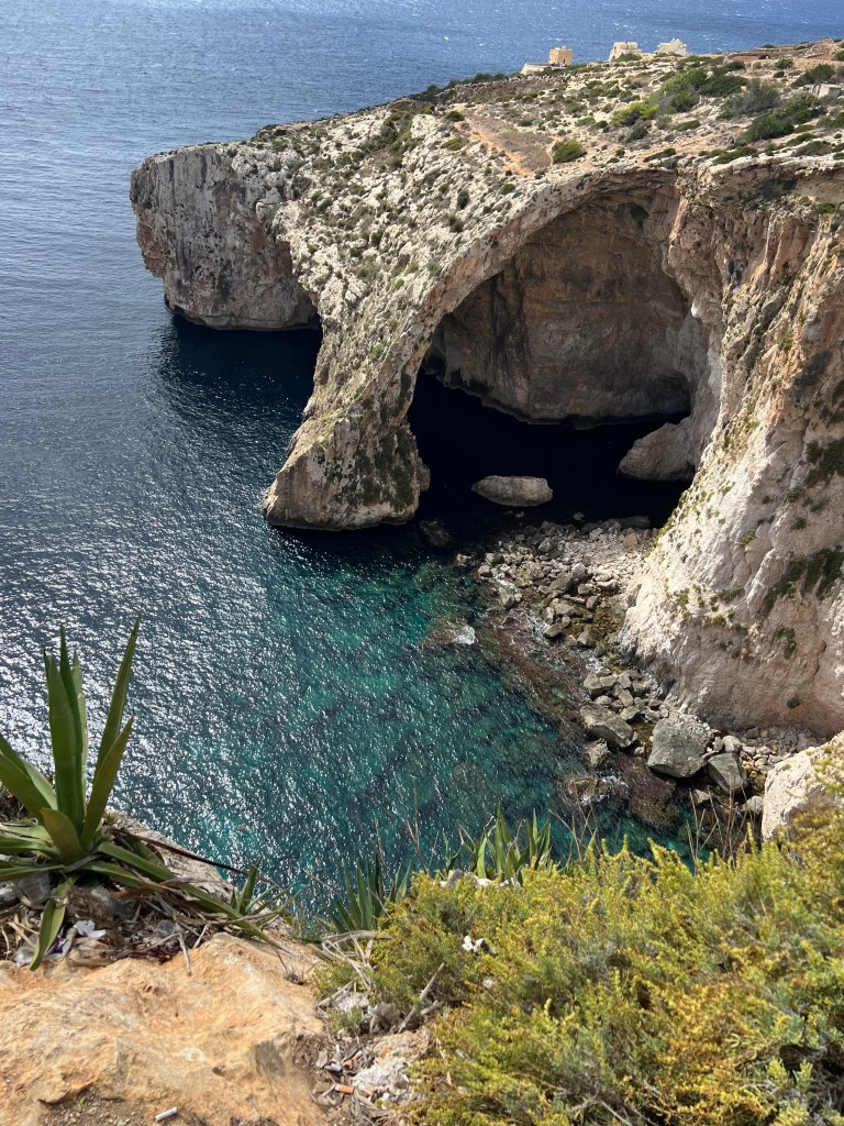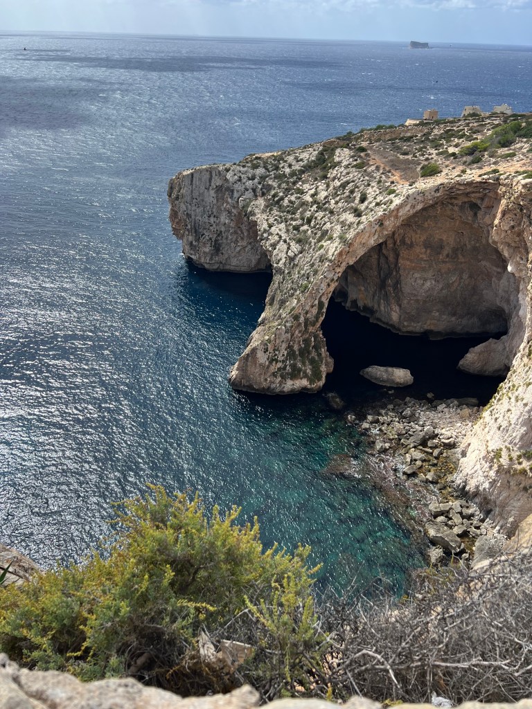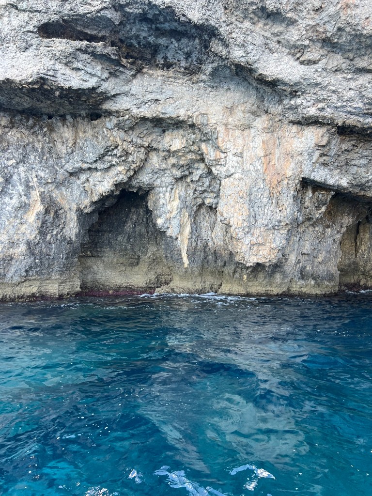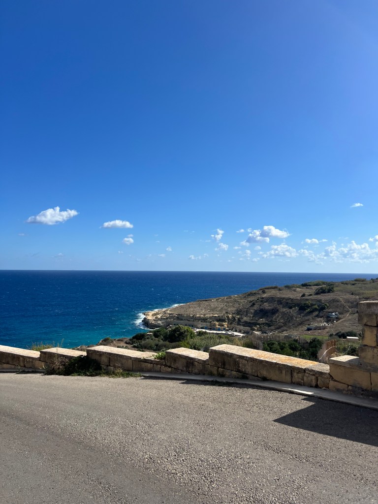 Our next stop was the Blue Grotto, and we decided to walk instead of getting another Uber. It’s a mostly downhill walk, which begins with a nice wide sidewalk but ends in a sketchy amount of shoulder to walk along. It took us about 20 minutes. We definitely would have done a Blue Grotto boat tour, but it was really windy again today and there were no boats heading out. So we just admired the views from the cliffside view point.