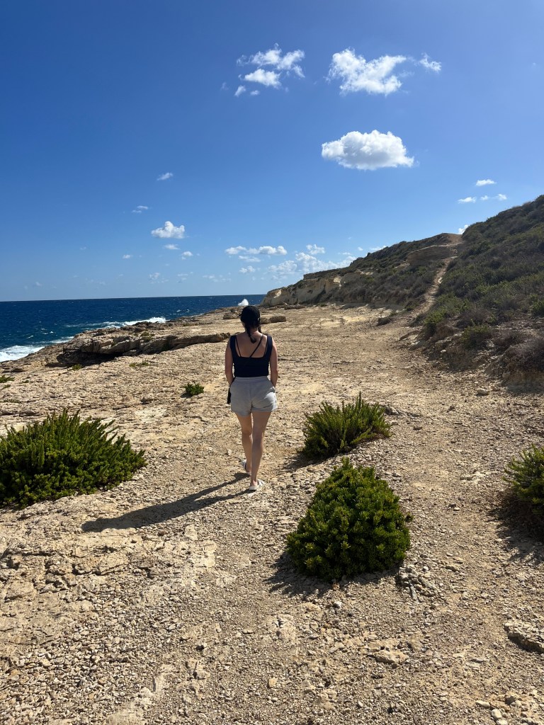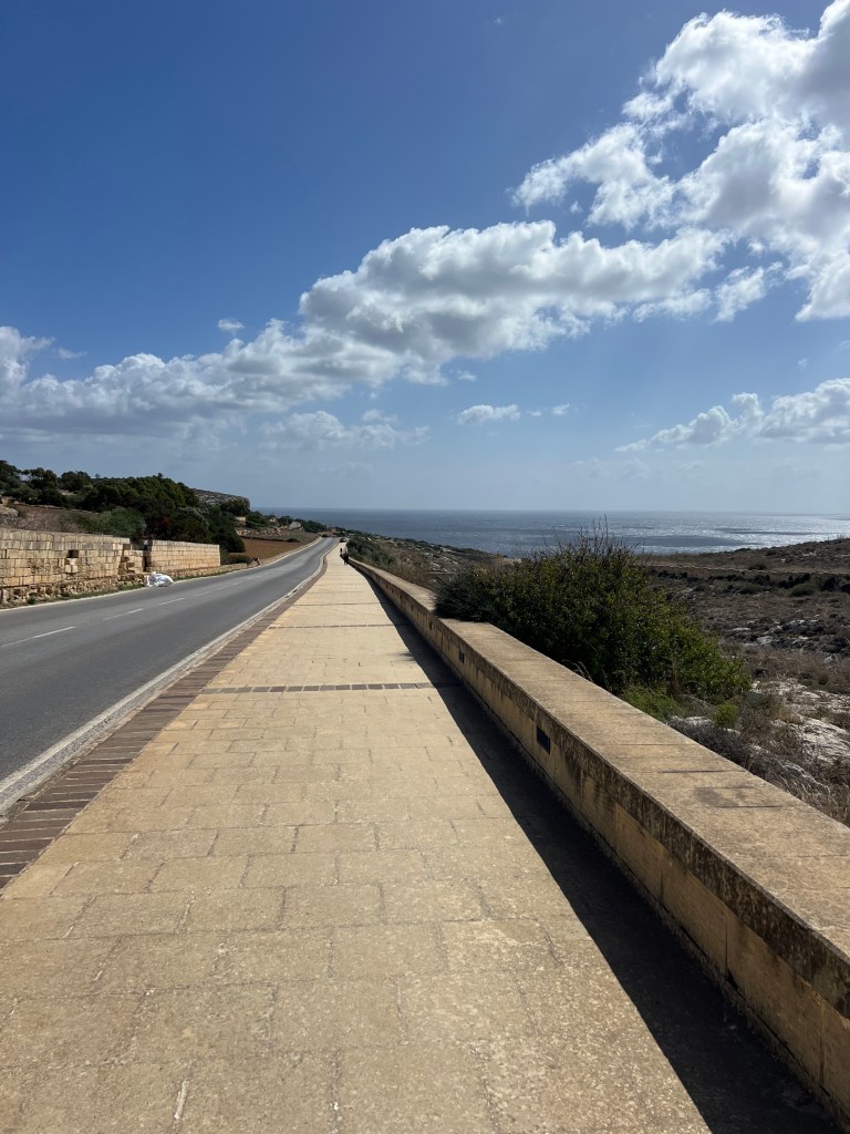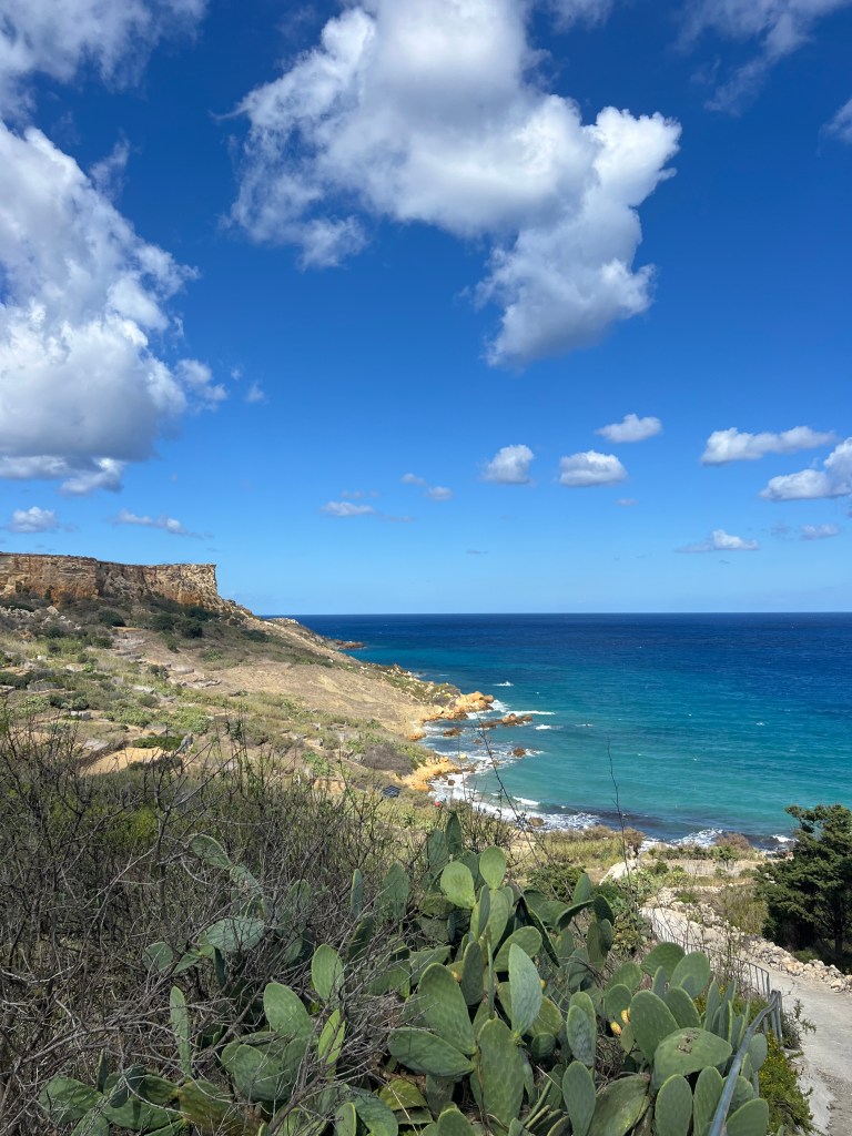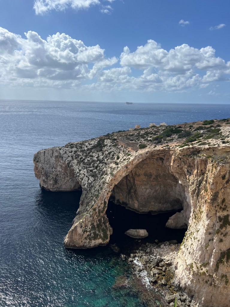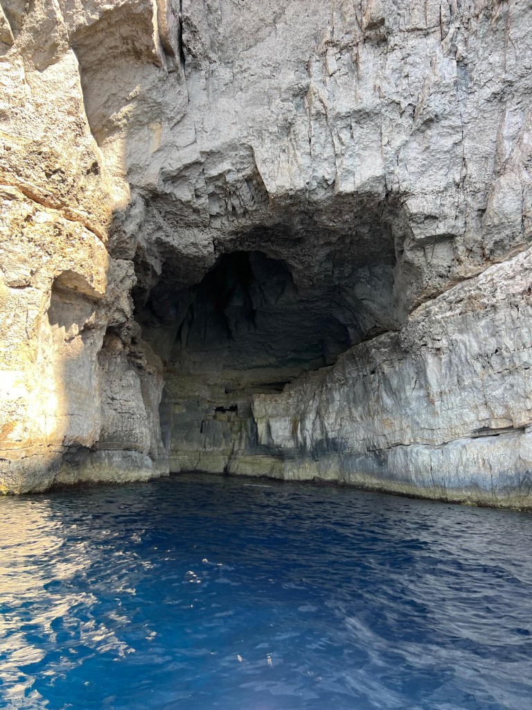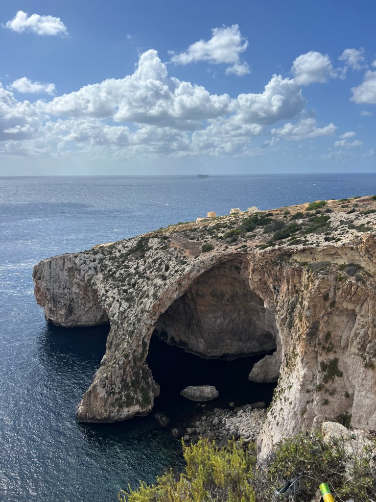 Our next stop was the Blue Grotto, and we decided to walk instead of getting another Uber. It’s a mostly downhill walk, which begins with a nice wide sidewalk but ends in a sketchy amount of shoulder to walk along. It took us about 20 minutes. We definitely would have done a Blue Grotto boat tour, but it was really windy again today and there were no boats heading out. So we just admired the views from the cliffside view point.