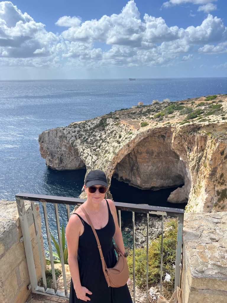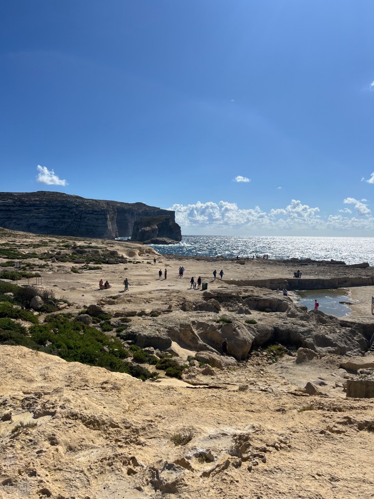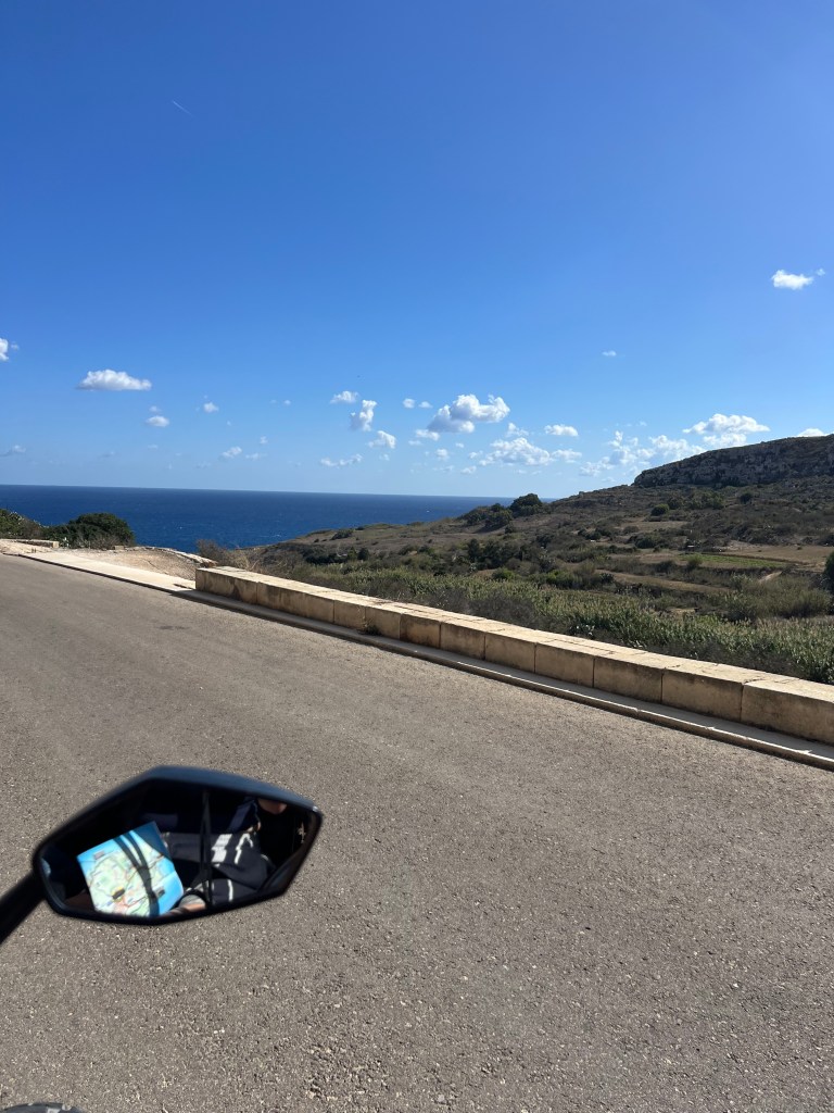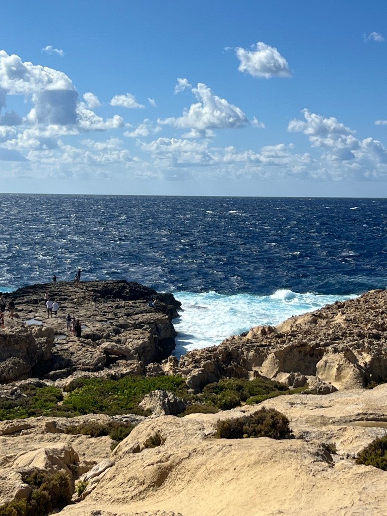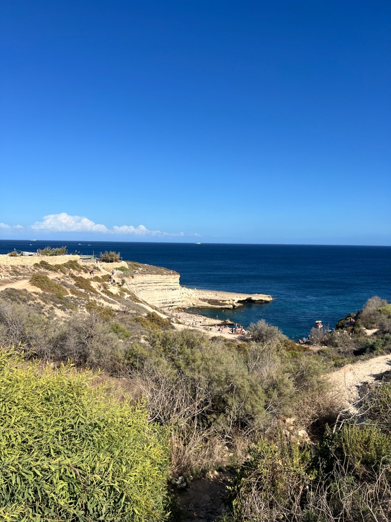 Our next stop was the Blue Grotto, and we decided to walk instead of getting another Uber. It’s a mostly downhill walk, which begins with a nice wide sidewalk but ends in a sketchy amount of shoulder to walk along. It took us about 20 minutes. We definitely would have done a Blue Grotto boat tour, but it was really windy again today and there were no boats heading out. So we just admired the views from the cliffside view point.