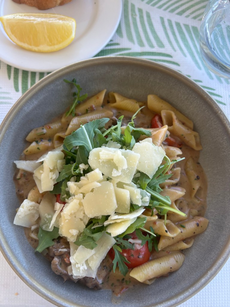We were seated outside and our table was so close to the sea we could literally see schools of fish swimming around, which was pretty cool! Stephen ordered the Aljotta – a traditional fish soup which came with some garlic bread. I ordered the Garganelli al filetto which is a pasta with beef fillet strips, sundried tomatoes, arugula, cherry tomatoes and parmesan flakes. Delicious!