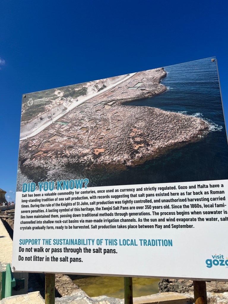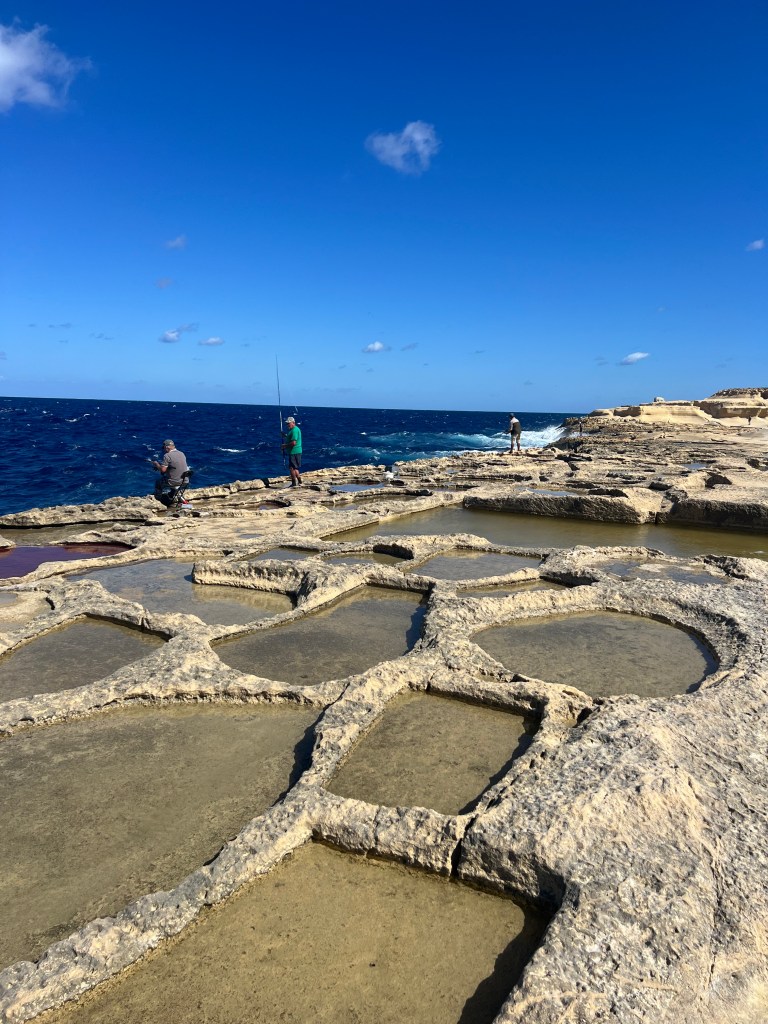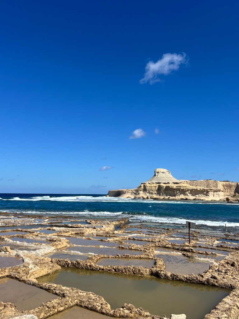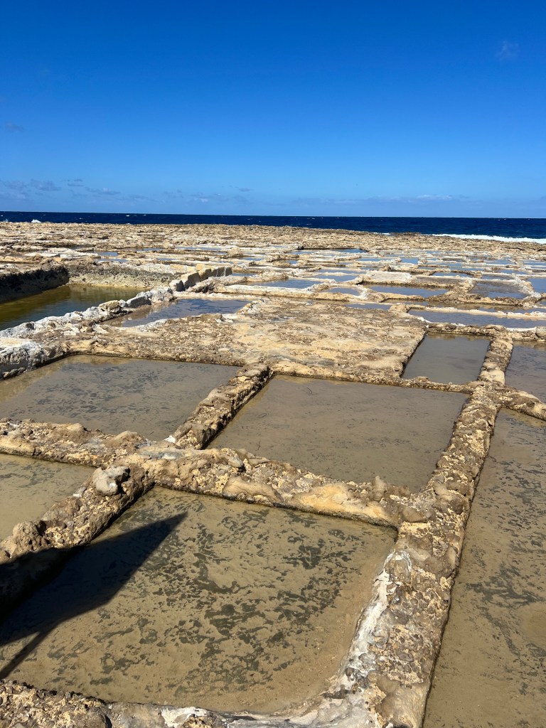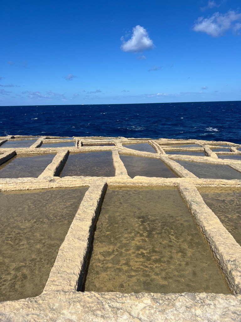 After lunch we continued on to Xwieni Bay’s Saltpans. This was such a cool place. I’ve never seen anything like it before. These giant checkerboard squares carved out of the flat limestone rocks that span across 3 km of the coastline right to the edge of the sea. The salt pans are over 350 years old and a Gozitan traditional way of sea salt production. The sea water that gathers in these reservoirs evaporates and the salt crystals that are left are then gathered and dried.