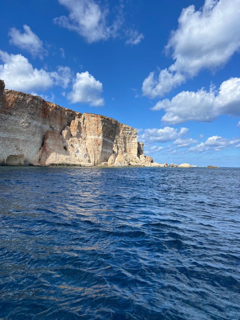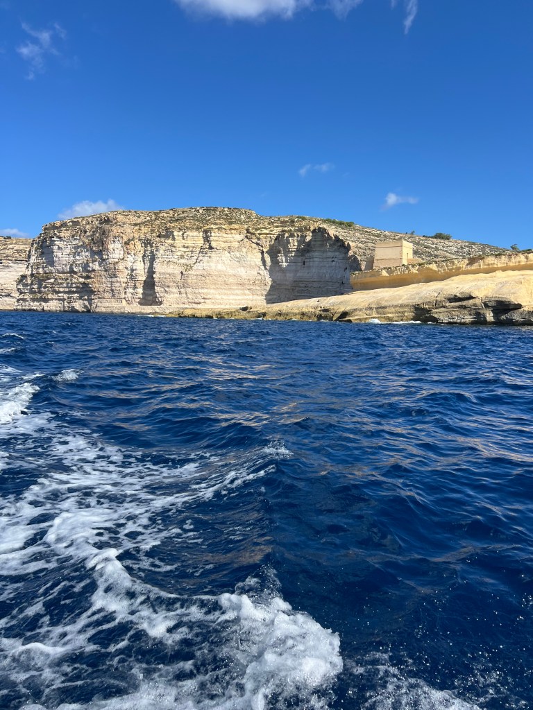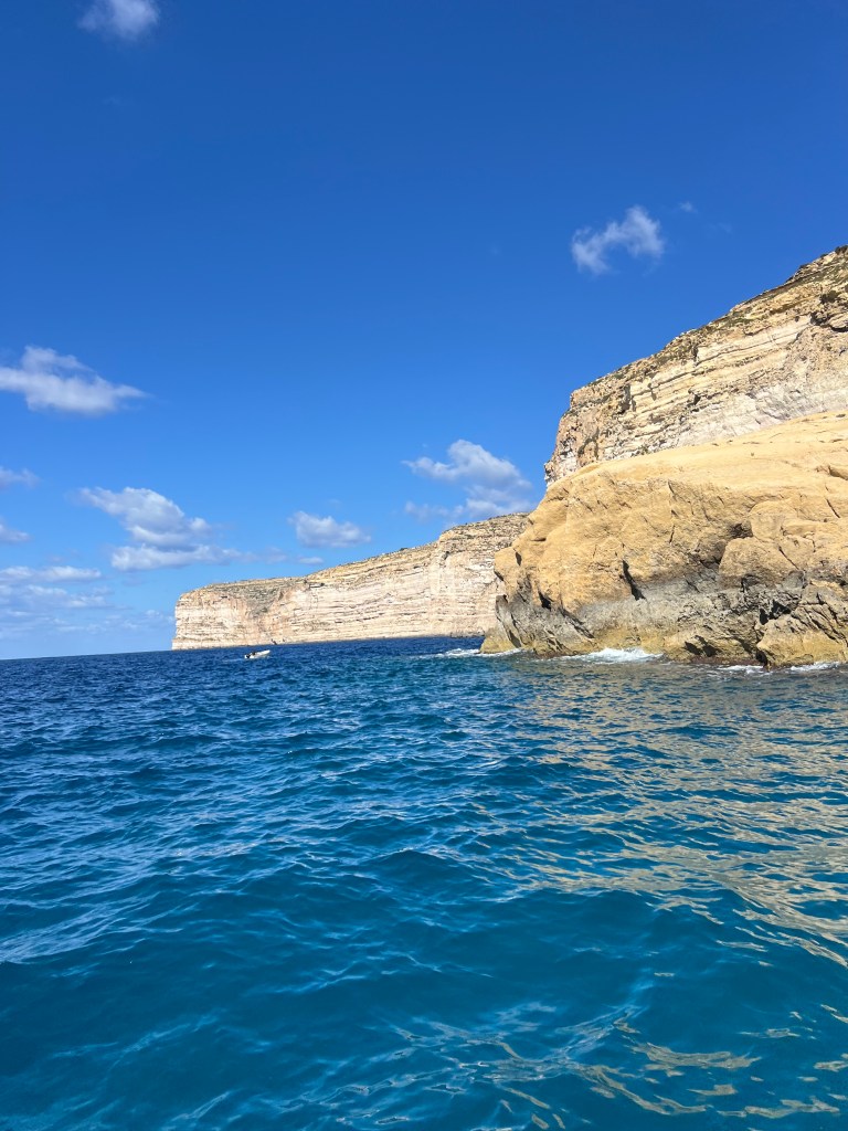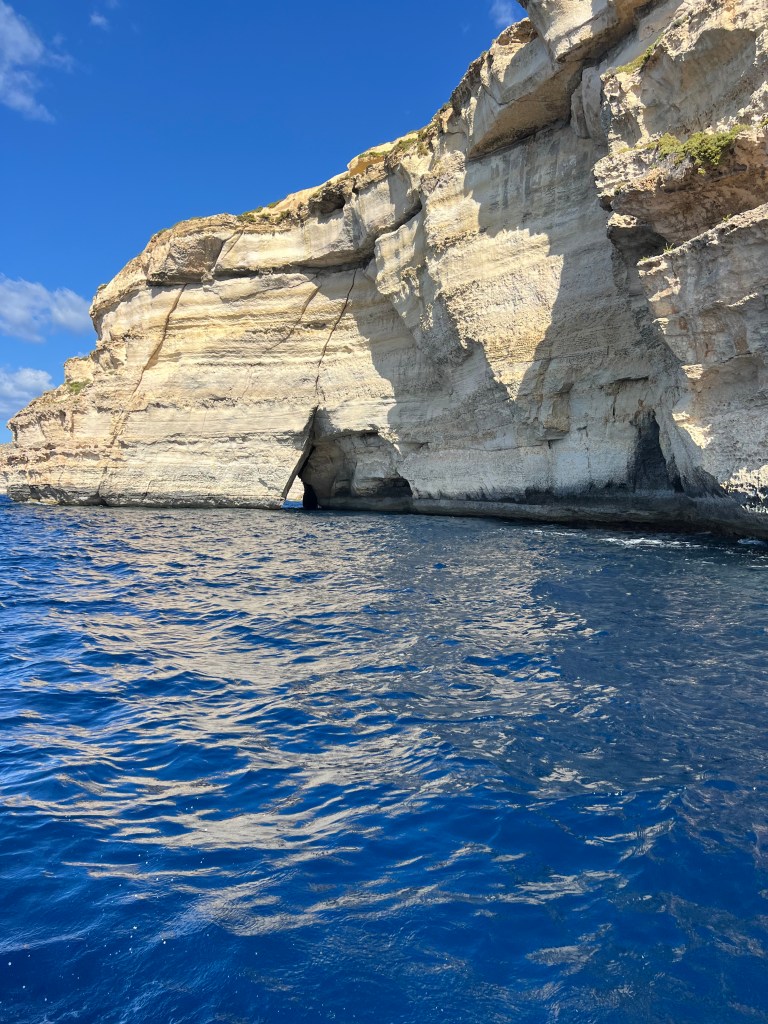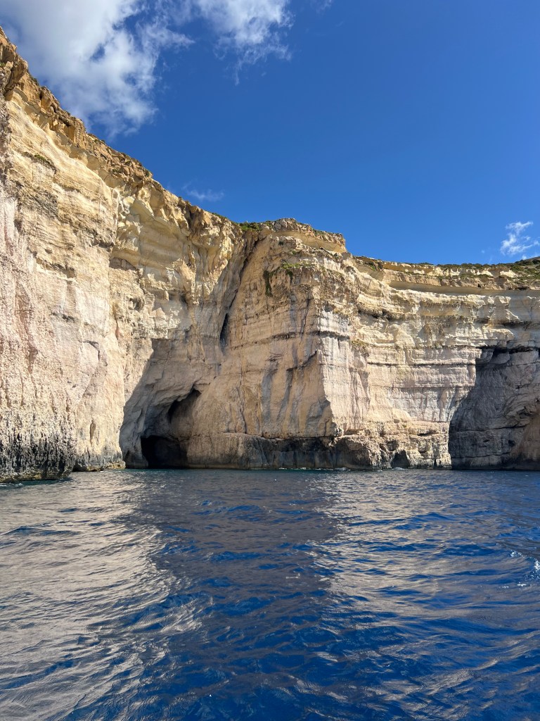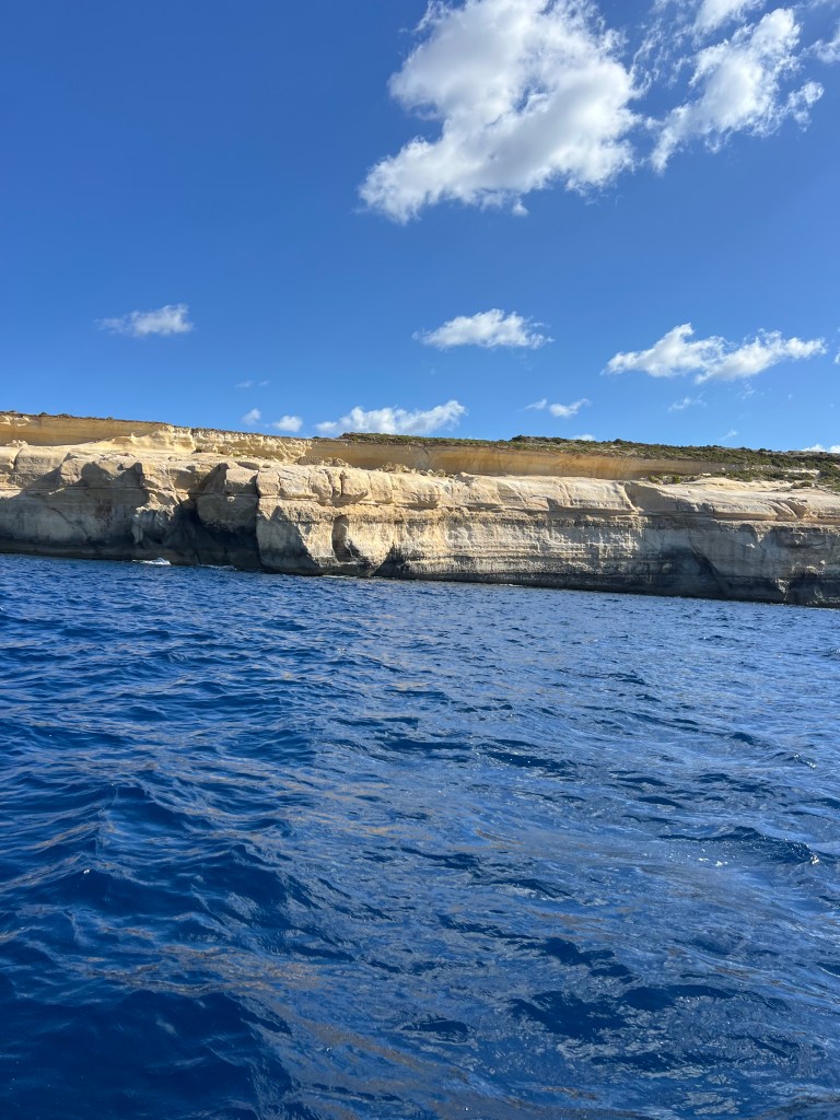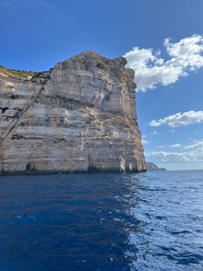 Then as we exit the bay and turn left, the views of the Ta’Cenc and Sanap Cliffs are breathtaking. These dramatic and majestic limestone cliffs are up to 130 meters high!!! We felt so small as we motored along, marvelling at this amazing stretch of coastline.