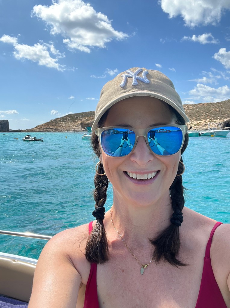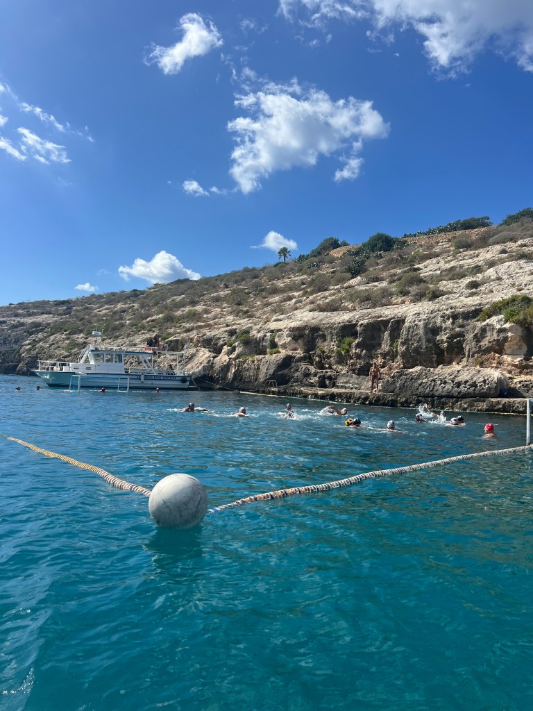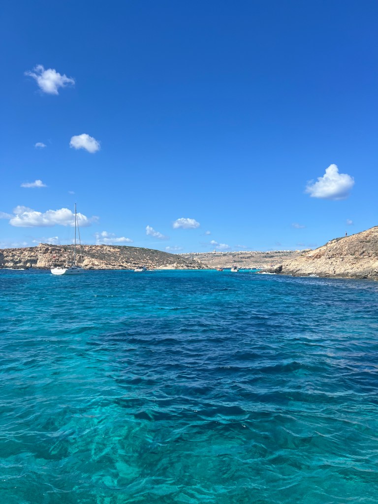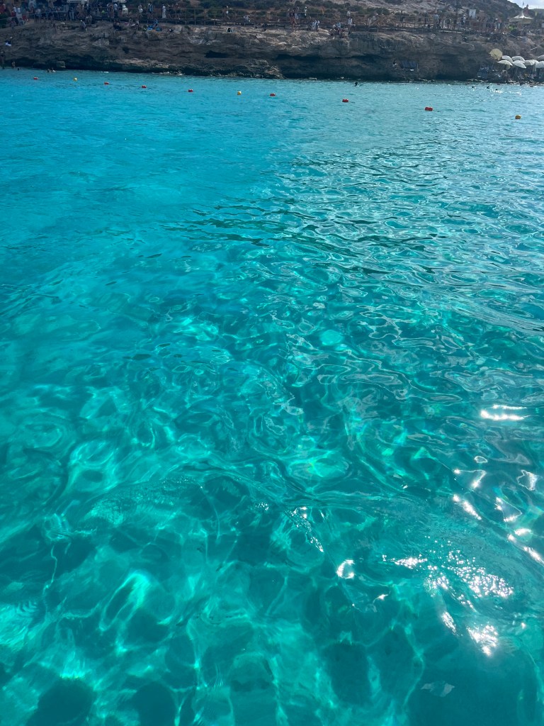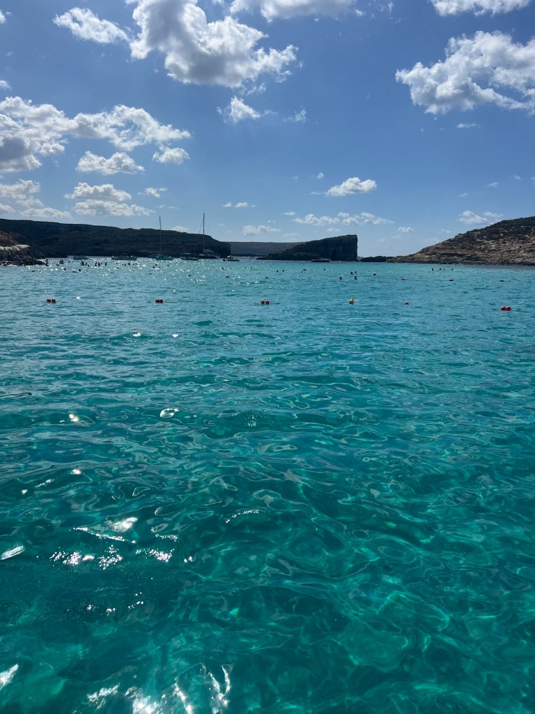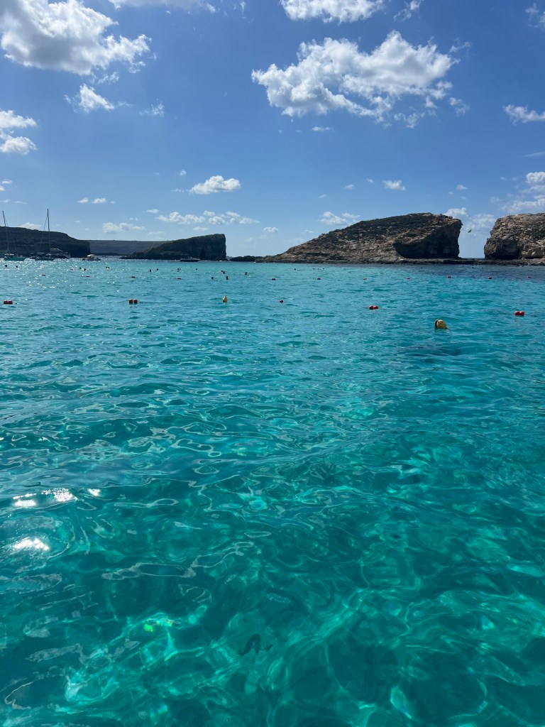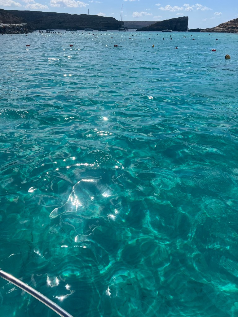 As we approached Comino Island, we could see that Blue Lagoon already looked very busy. Multiple large ferry boats and plenty of smaller boats anchored near the roped off swim area. But let’s not focus on the crowds, let’s focus on why we came here in the first place. Oh but that crystal clear turquoise water!!! IT IS GORGEOUS!!!