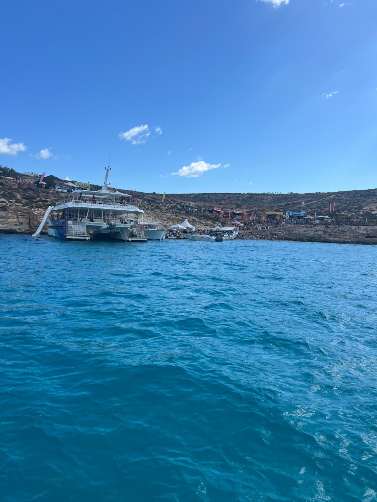 Zipping along, we didn’t make any more stops until we made it to the Blue Lagoon. We were warned to steer widely from the fast ferries because they throw a large wake. And as we made our way across Mgarr harbour we passed the regular car ferry and the fast ferry. And it was definitely true, the regular ferry had little to no wake but the fast ferry has a large, long wake. So if you’re chartering a self drive boat, keep that in mind.