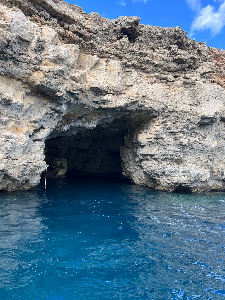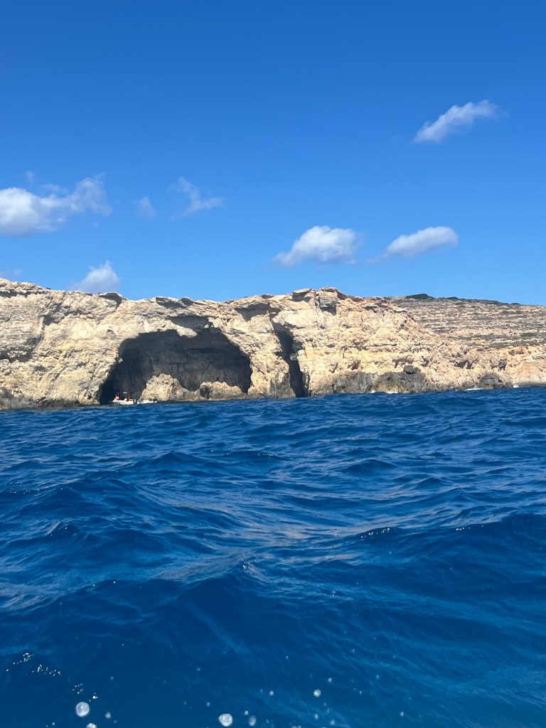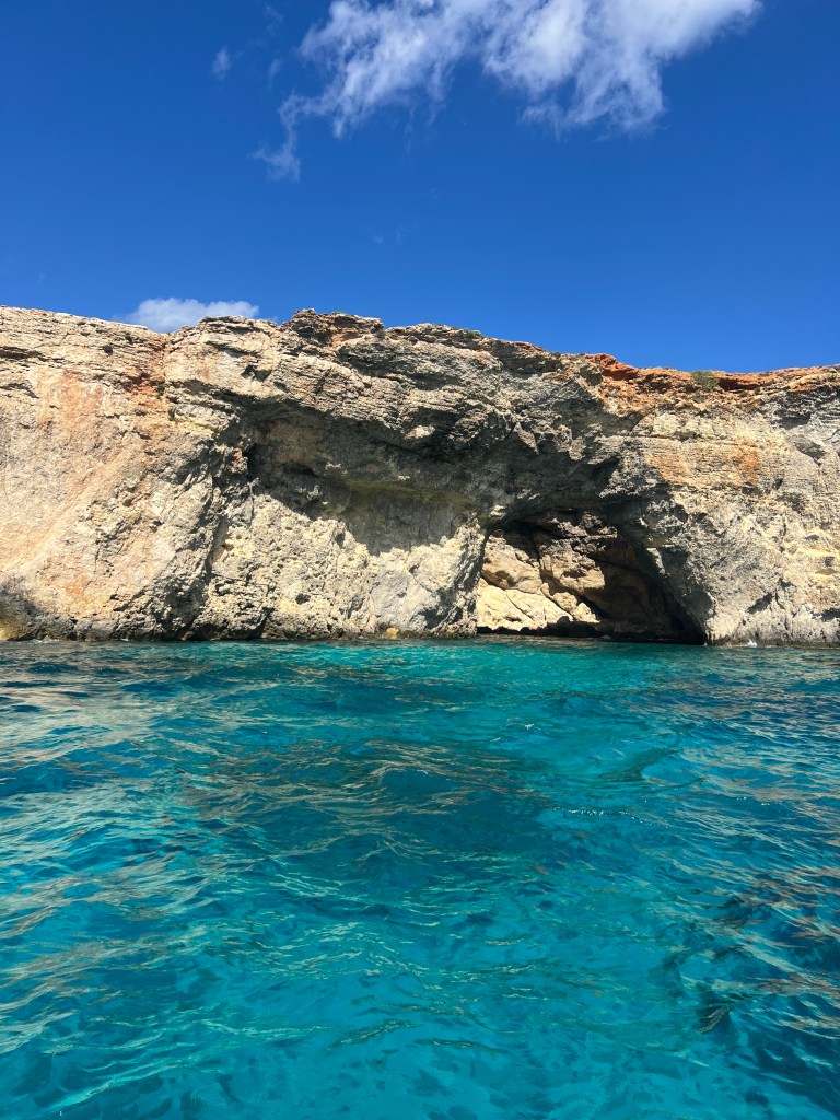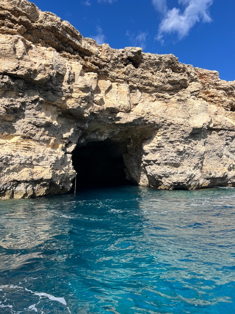Once our new boat arrived and we transferred our belongings we were on our way again. We decided to explore in the direction of counter clockwise, so we headed south towards St Mary’s tower and all along the coast line, stopping to check out caves along the way. Comino is a pretty small island, just 2.5km by 1.5km. There are walking trails but we felt like we were getting short on time so we stuck with exploring by sea.