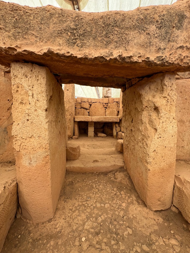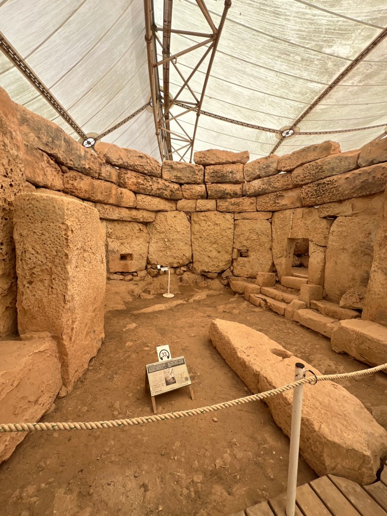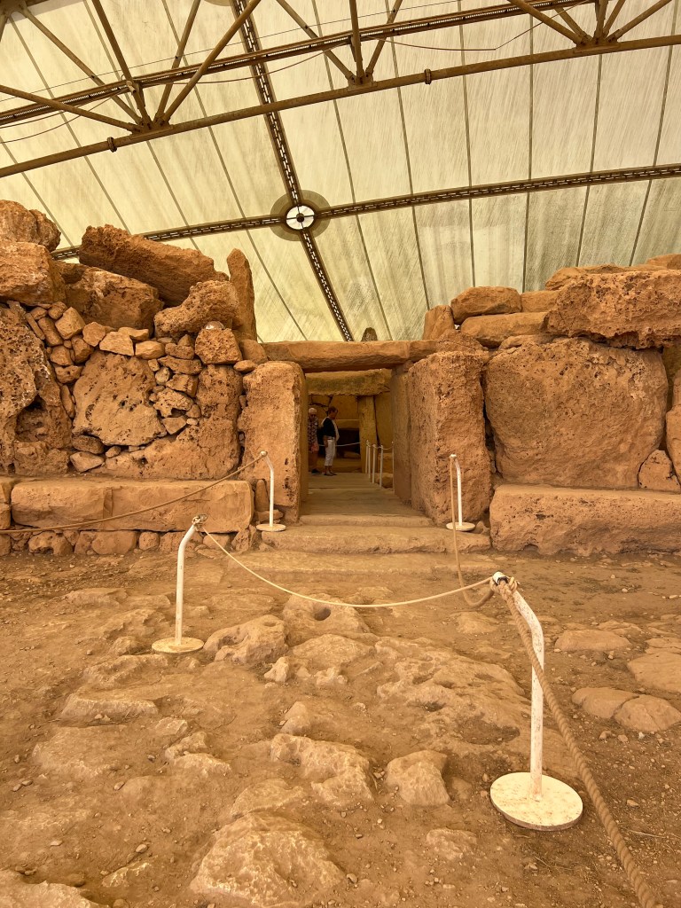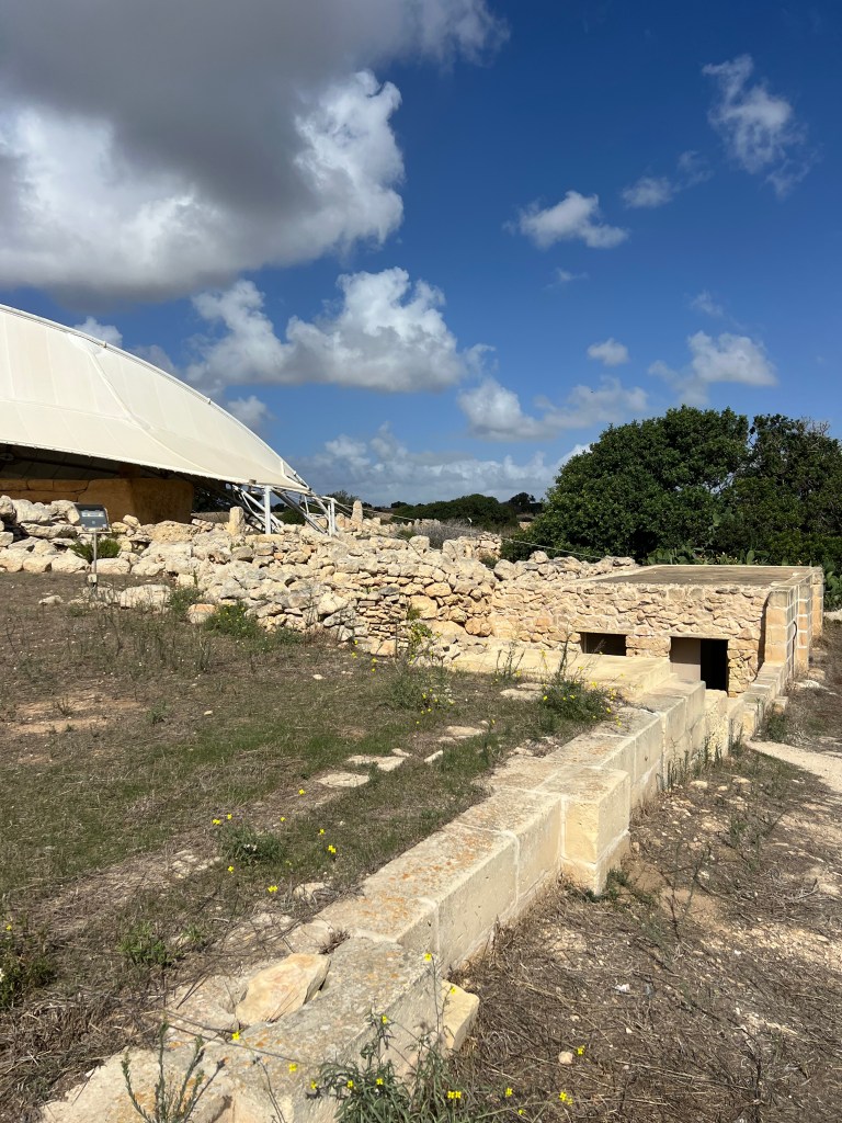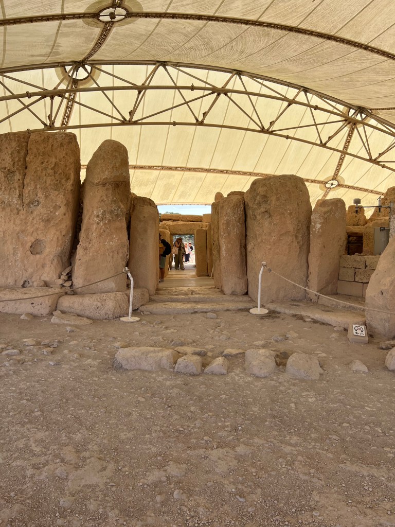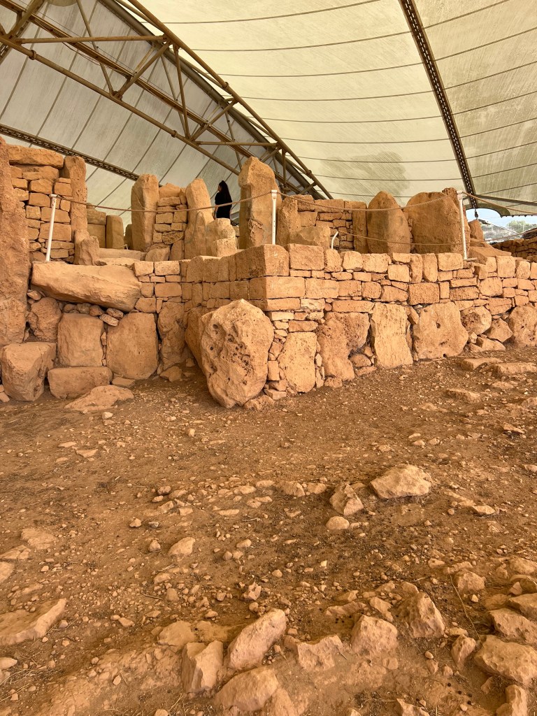 We are dropped off at the front of the Visitor Information Center which is a modern building and I highly recommend starting your tour here as there is so much information about the temples. We started the tour with a short 3D video which explains how the temples were built and used. Then after exiting the theater you enter the exhibit part where you’ll find archaeological discoveries, reconstructions of rituals and interactive screens that help you visualize life in Malta 5,000 years ago.