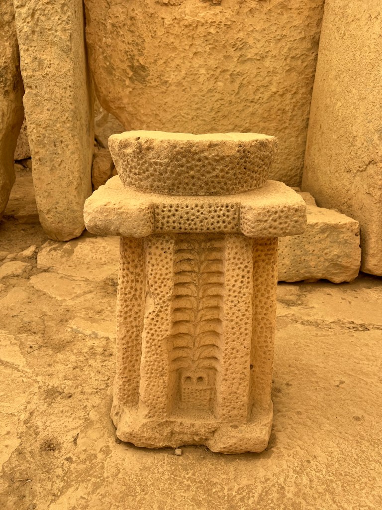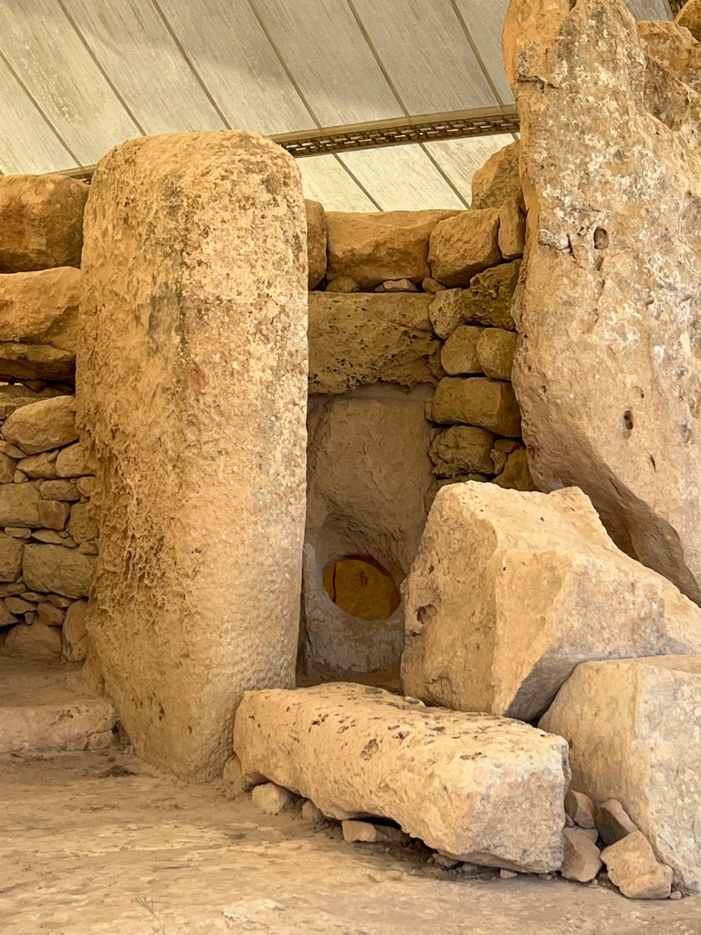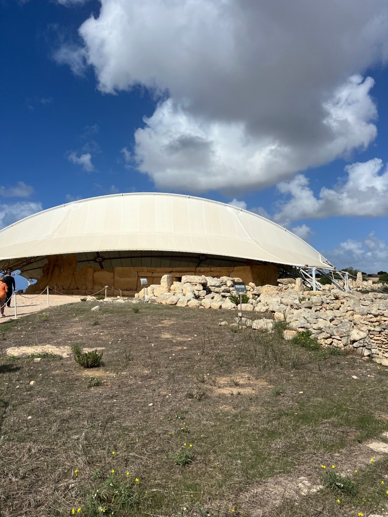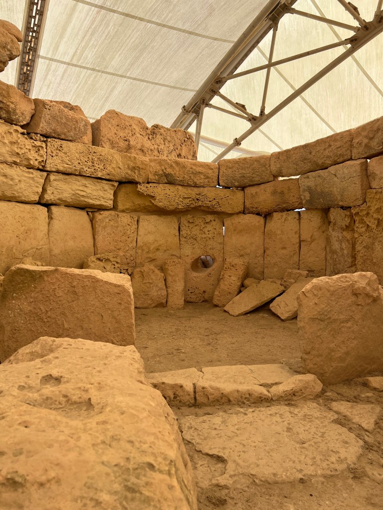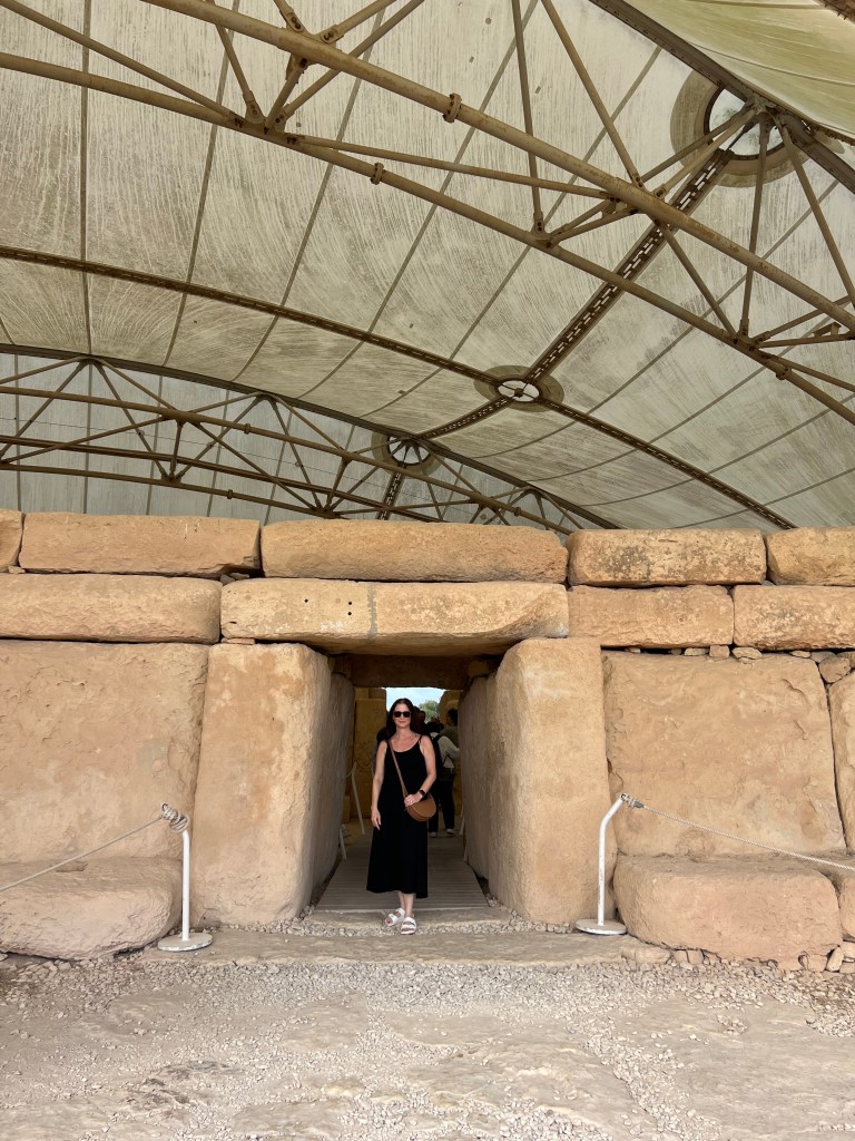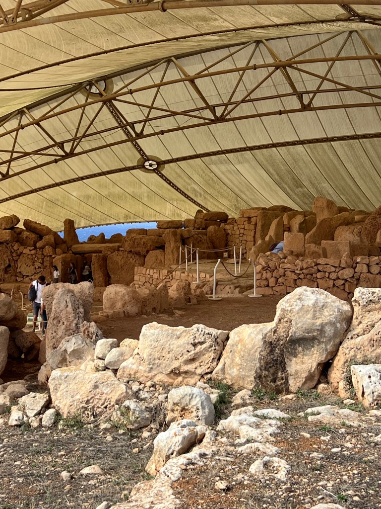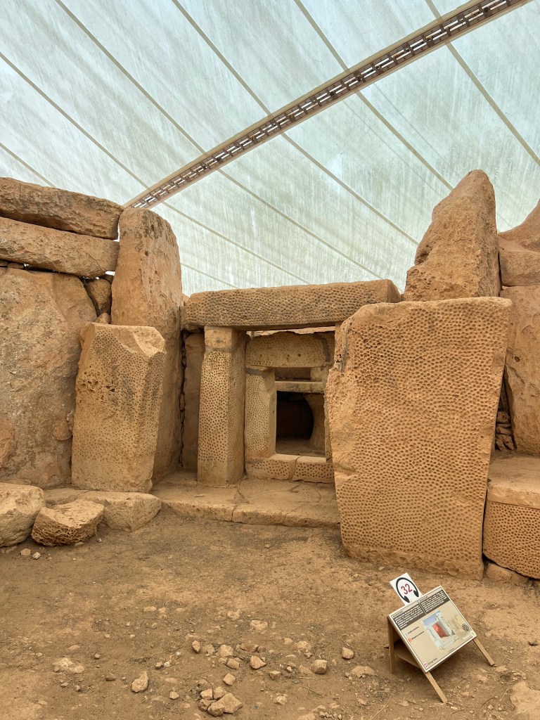 We are dropped off at the front of the Visitor Information Center which is a modern building and I highly recommend starting your tour here as there is so much information about the temples. We started the tour with a short 3D video which explains how the temples were built and used. Then after exiting the theater you enter the exhibit part where you’ll find archaeological discoveries, reconstructions of rituals and interactive screens that help you visualize life in Malta 5,000 years ago.