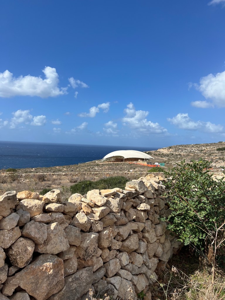 A little further down hill, and closer to the cliff edge, is the Mnajdra temple. It’s also covered by a large white canopy to protect it from the elements. This temple is also better preserved because the rocks that were used here are a harder type of limestone.