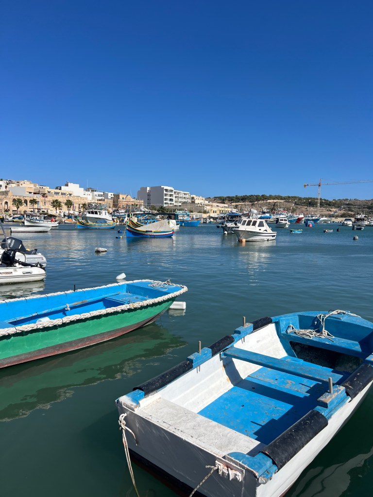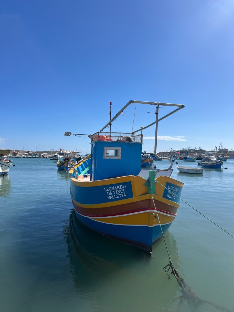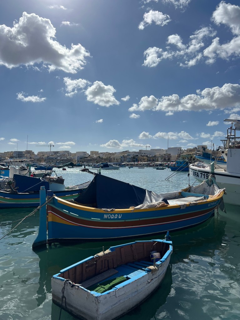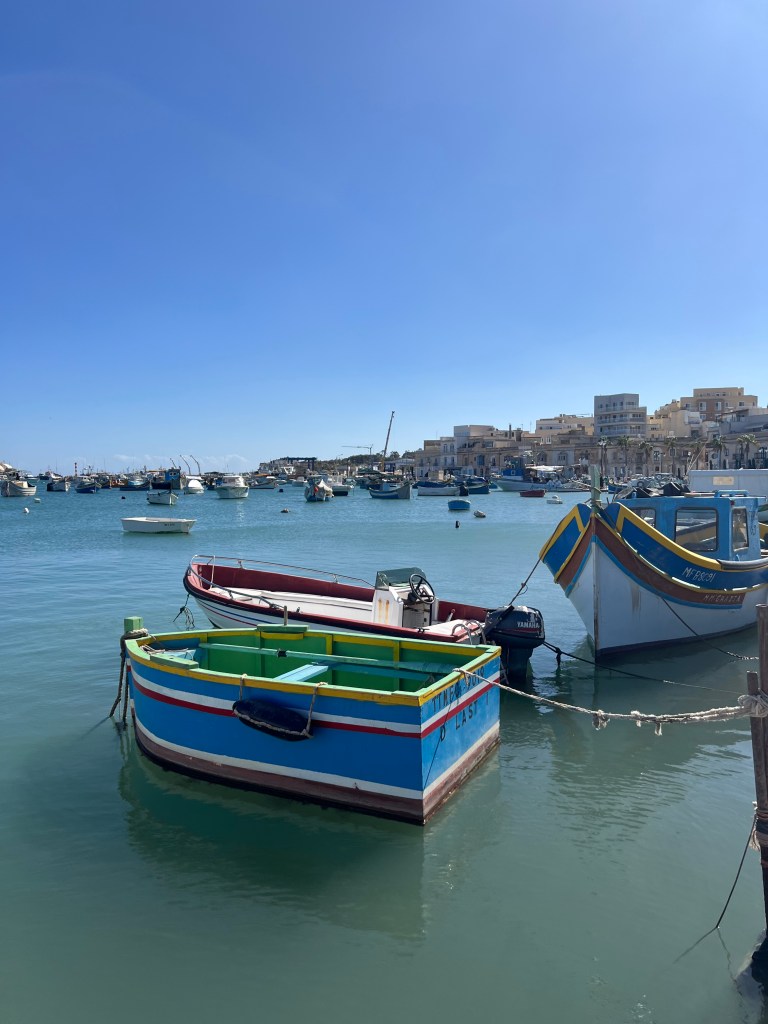 Then we Ubered to Marsaxlokk, an ancient fishing village which has become the home to a weekly fish and souvenir market. The seafront is lined with stall after stall of vendors, which definitely takes away from the natural beauty of the harbour. However, the brightly painted traditional boats (called luzzu) in the harbour were fun to look at and take some photos. We debated about getting on one of the tour boats to take us to St Peter’s Pool, but they seemed pretty crowded and decided to walk to St Peter’s Pool instead.