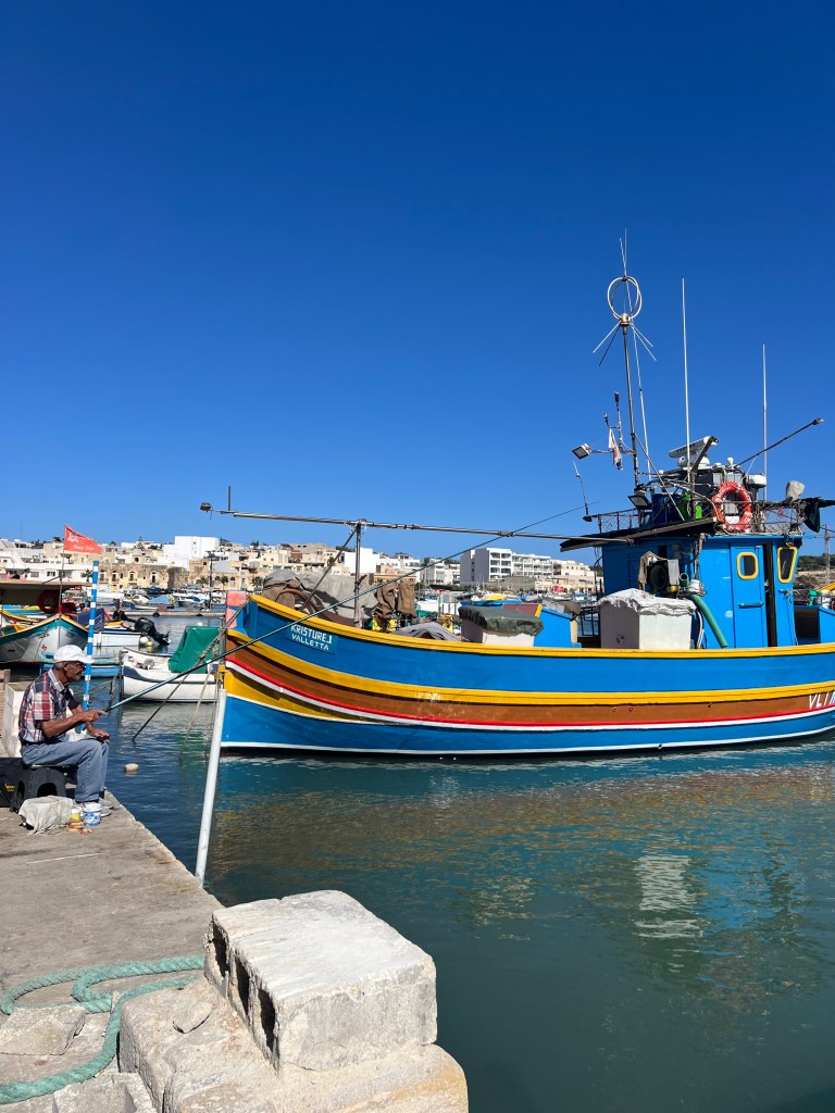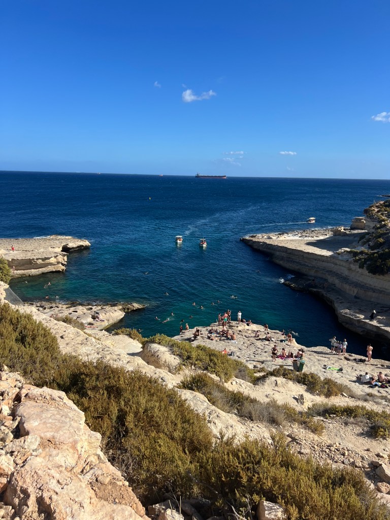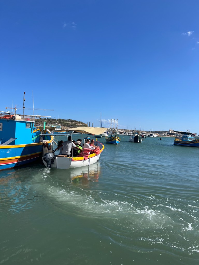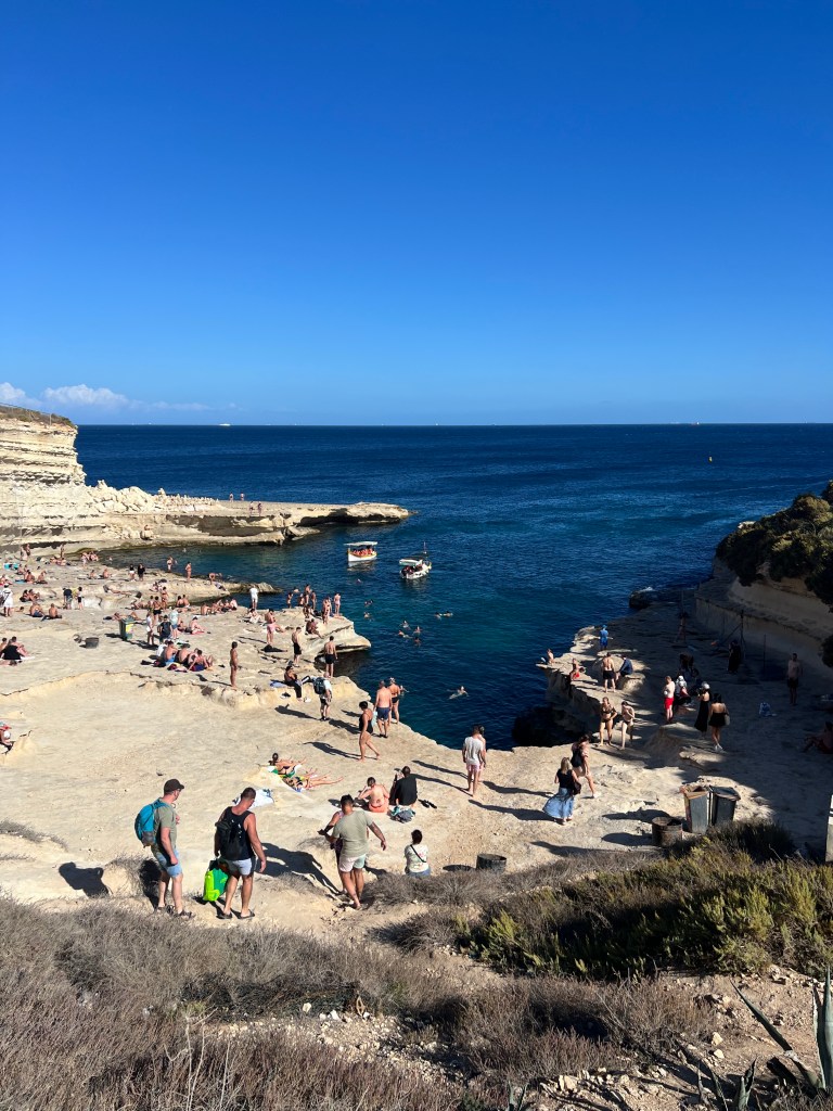 Then we Ubered to Marsaxlokk, an ancient fishing village which has become the home to a weekly fish and souvenir market. The seafront is lined with stall after stall of vendors, which definitely takes away from the natural beauty of the harbour. However, the brightly painted traditional boats (called luzzu) in the harbour were fun to look at and take some photos. We debated about getting on one of the tour boats to take us to St Peter’s Pool, but they seemed pretty crowded and decided to walk to St Peter’s Pool instead.
