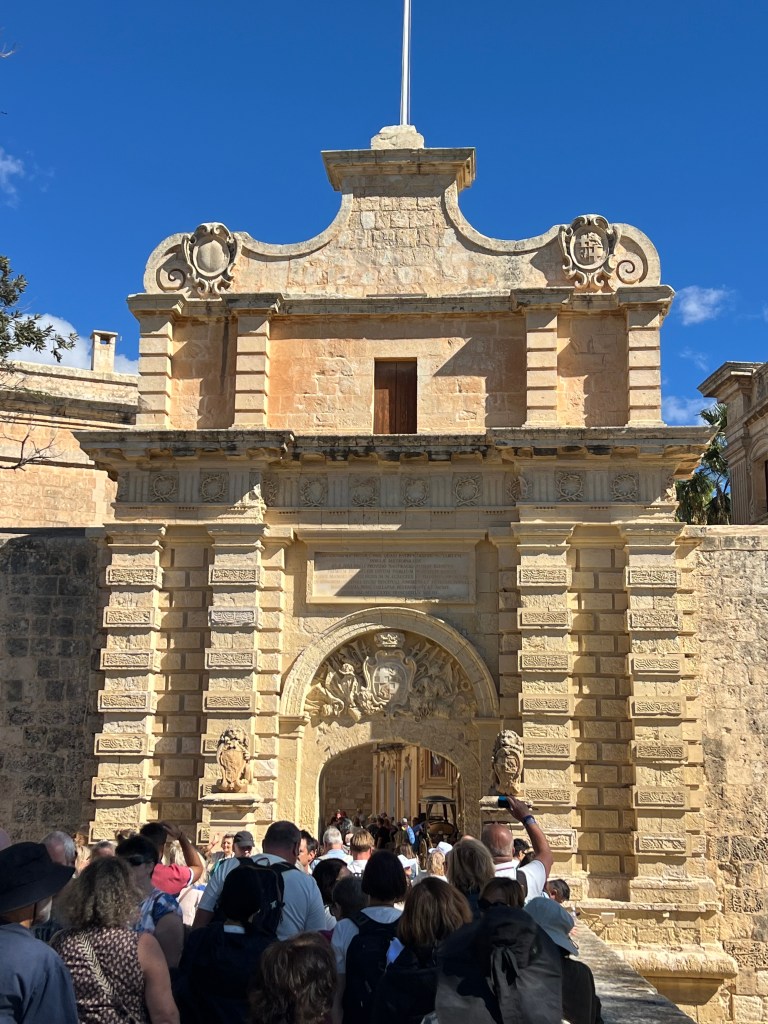 Our driver drops us off as close to the Mdina Gate as possible. Because of our messing around with various modes of transportation this morning, we’re arriving later than I had hoped and the crowds have descended upon the city already.
