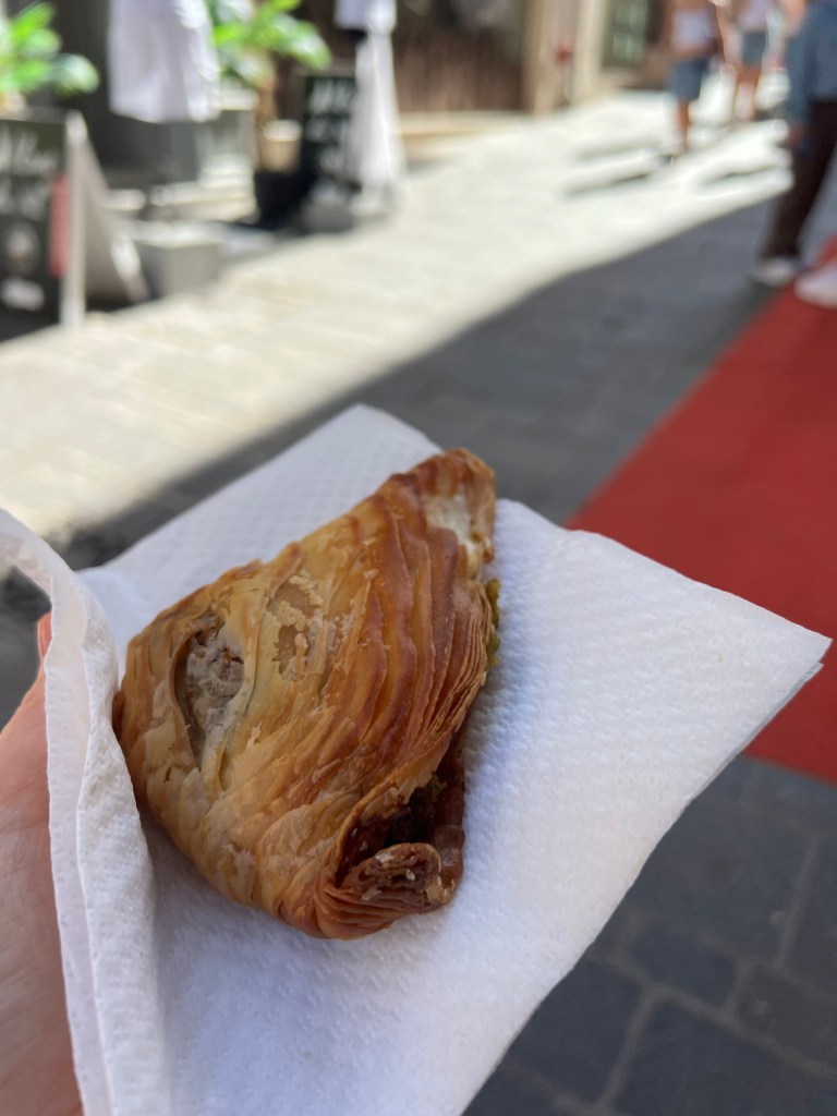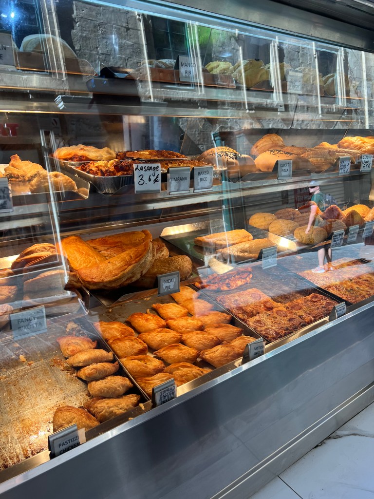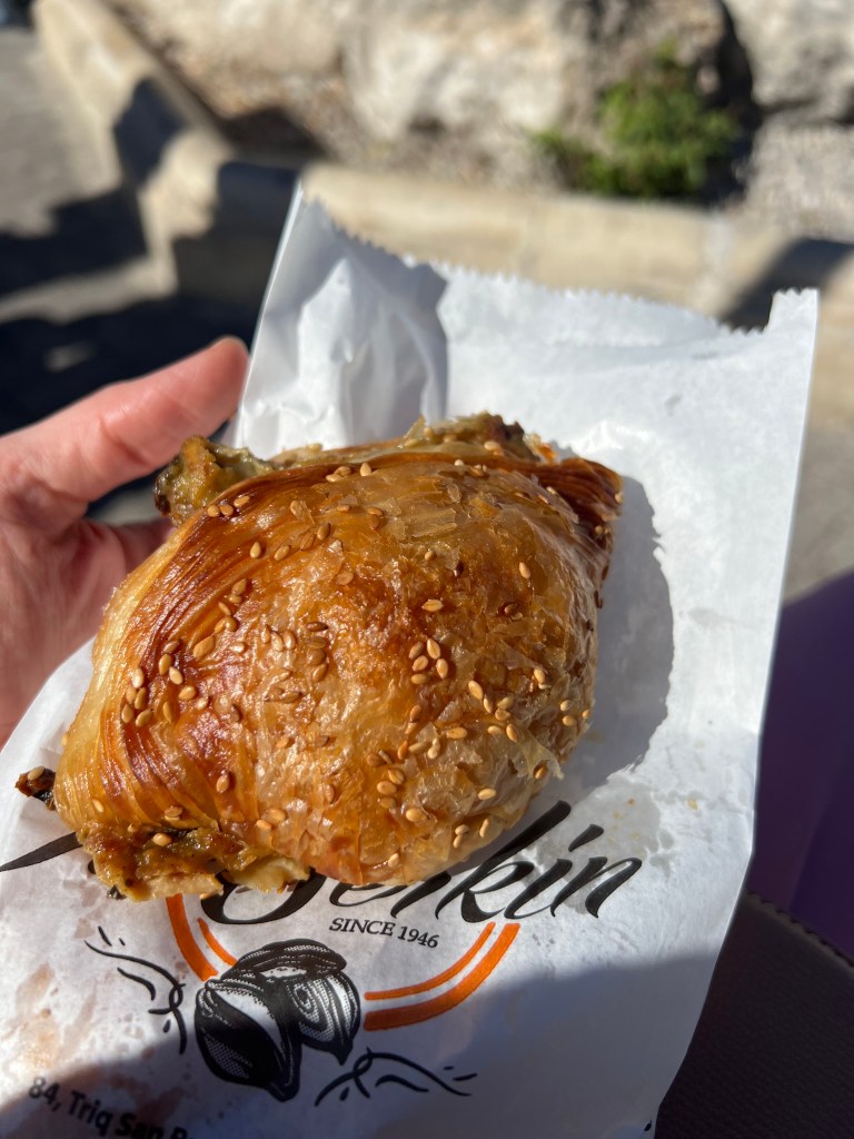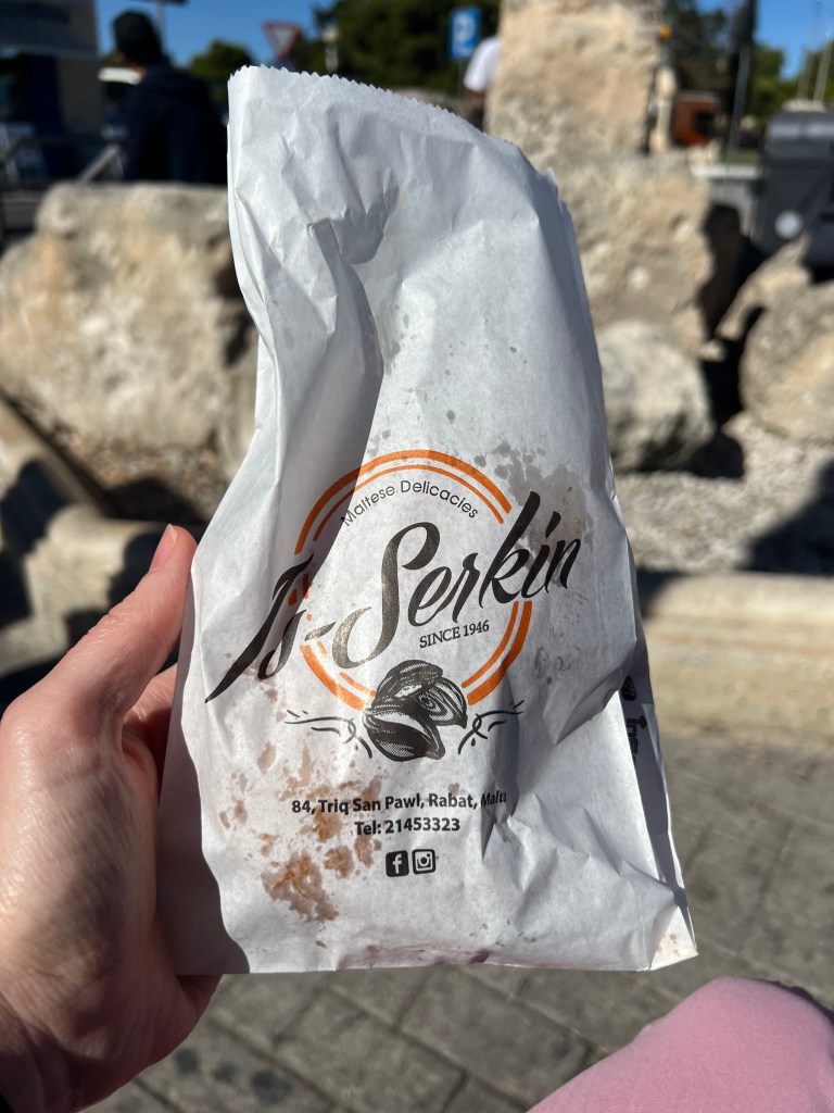 From Mdina we walked to Rabat, they’re basically side by side cities so it wasn’t a far walk. We headed directly to Is-Serkin Crystal Palace. In my research this was THE place to try Pastizzi. Established in 1945, Crystal palace specializes in the traditional Maltese pastries called pastizzi. It’s a warm flakey, buttery pastry stuffed with your choice of chicken, ricotta or peas. They are seriously delicious and only cost 0.50 euros! My favorite was the chicken. We sat outside across the street on a bench beside a fruit vendor (who was a total character!) and people watched while we snacked on our pastizzi. It was perfect. A wonderful way to spend the afternoon. Slow travel at its finest for us.