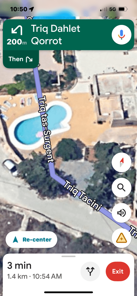 Another part that made it not so fun was that I was navigating and didn’t have my prescription sunglasses so that threw in a whole other level of craziness. And to add some more stress on top of my anxiety, for whatever reason google maps kept trying to take us through every round about on the right side of the road like in North America, so that was really screwing up my navigation. And then google would also try to take us down “roads” like this…over back yard pools!